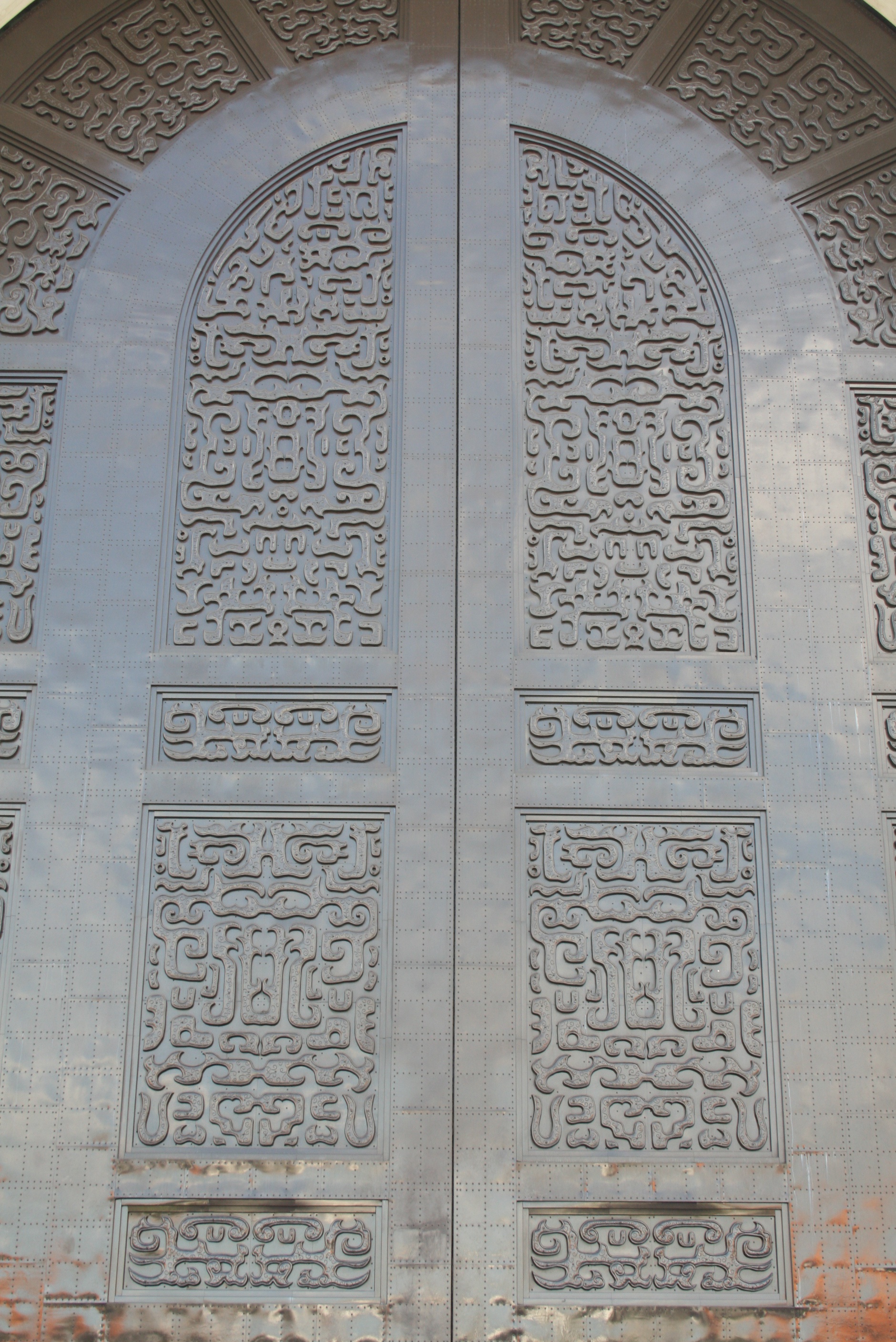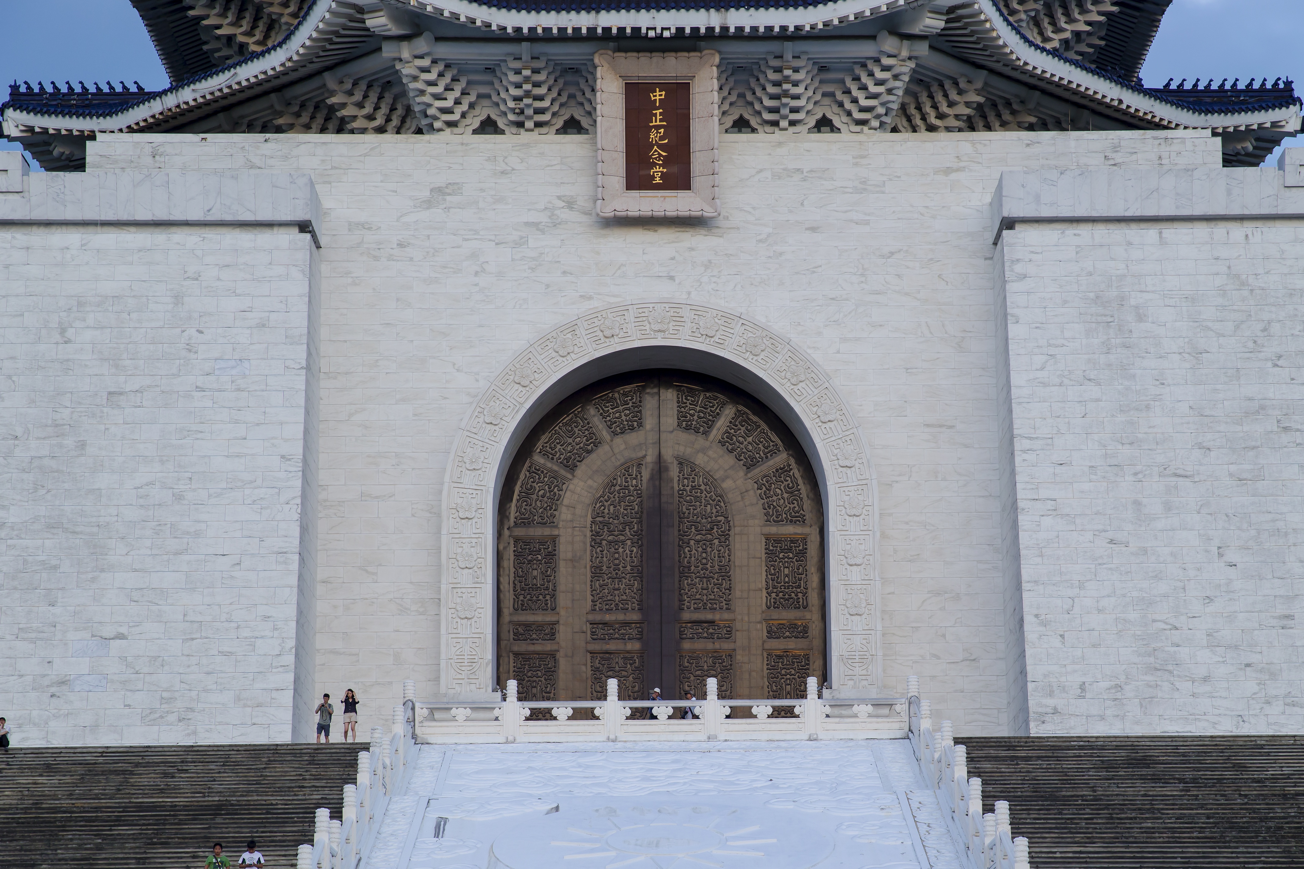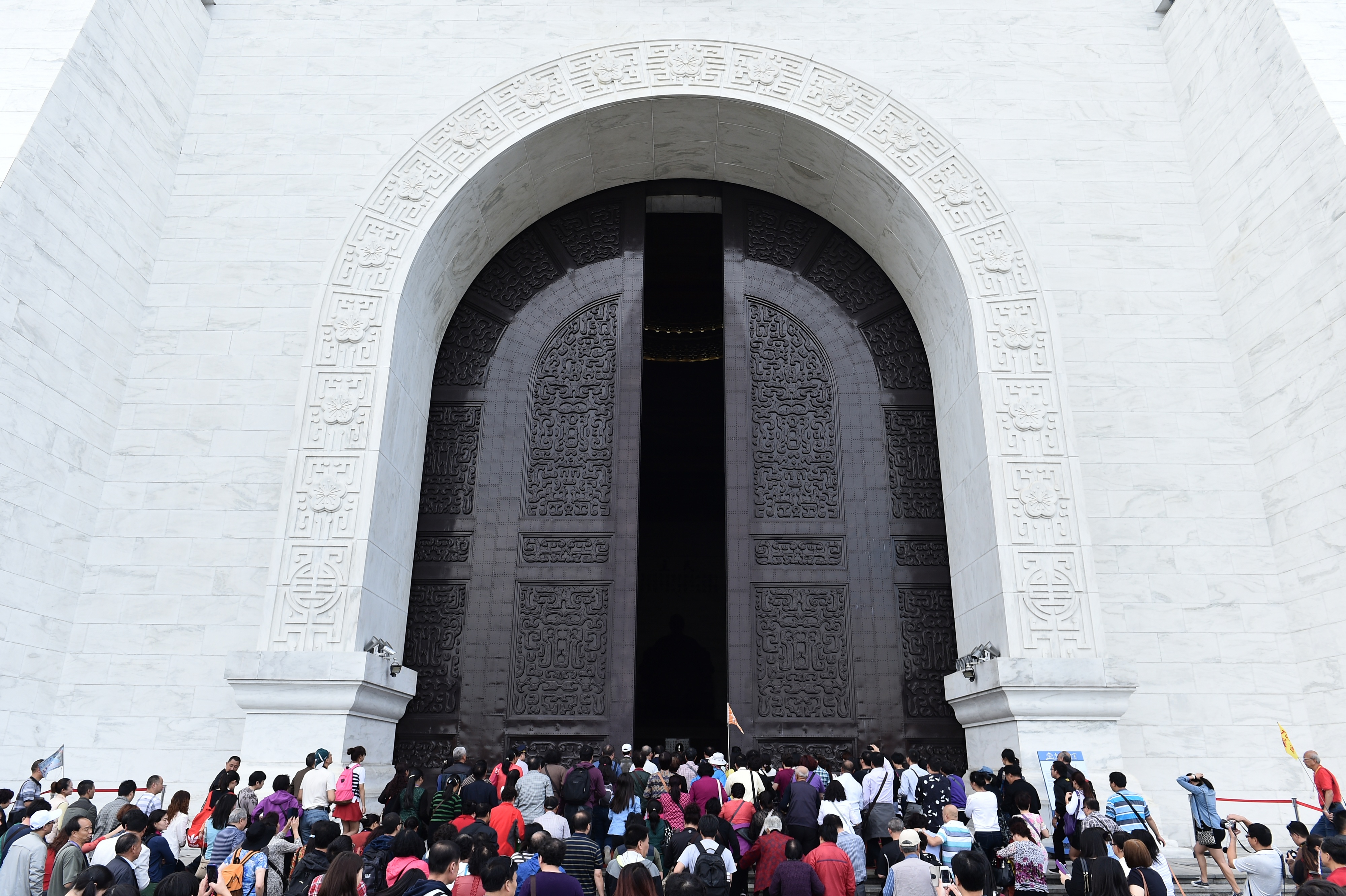 登上正面階梯,走上第3層臺基,來到銅像大廳銅門前。銅門每天早上9點準時開啟,迎接各地遊客,直到下午6點關門。若在銅門關閉時來訪,不妨仔細欣賞,它高度約17公尺,相當於5層樓高,為傳統中式圓拱造型,以鋼骨與鋼材鑄造而成。門上鑲嵌有螭虎等各種紋飾,具有吉祥如意的寓意。你能想像銅門有多重嗎?這兩扇銅門的重量高達75公噸,需搭配電動鋼軌,以利開關。