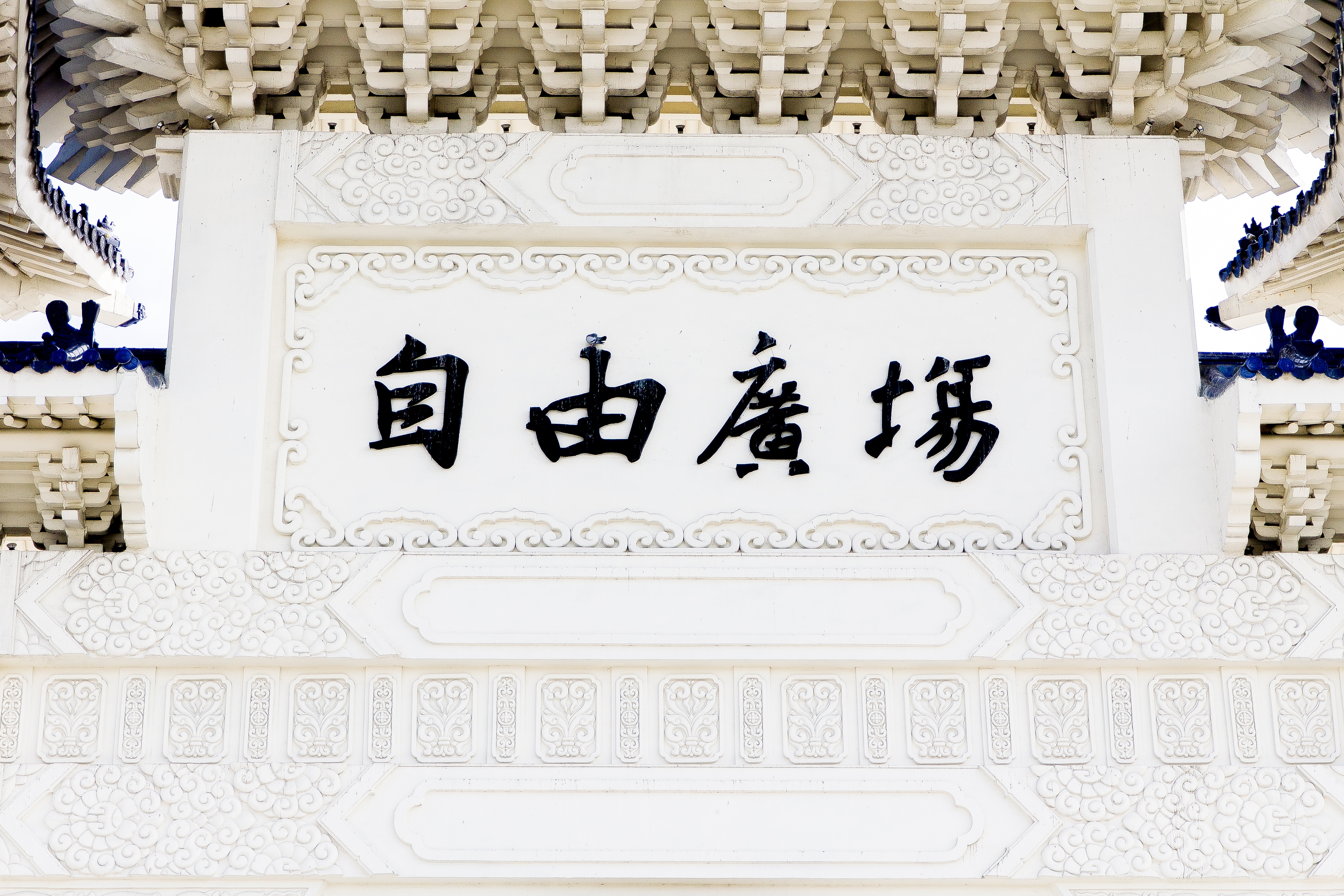 正面牌樓落成時,上面有「大中至正」4字,從右至左排列,語出王陽明《傳習錄》:「粹然大中至正之歸矣」。由書法家楊家麟以棍棒、鐵絲縛以麻繩,沾紅土調熱水,以歐陽詢體寫成。 而自2007年12月8日卸下「大中至正」字樣後,改書「自由廣場」至今,從左向右排列,字體係集王羲之各書帖內容節選而成。