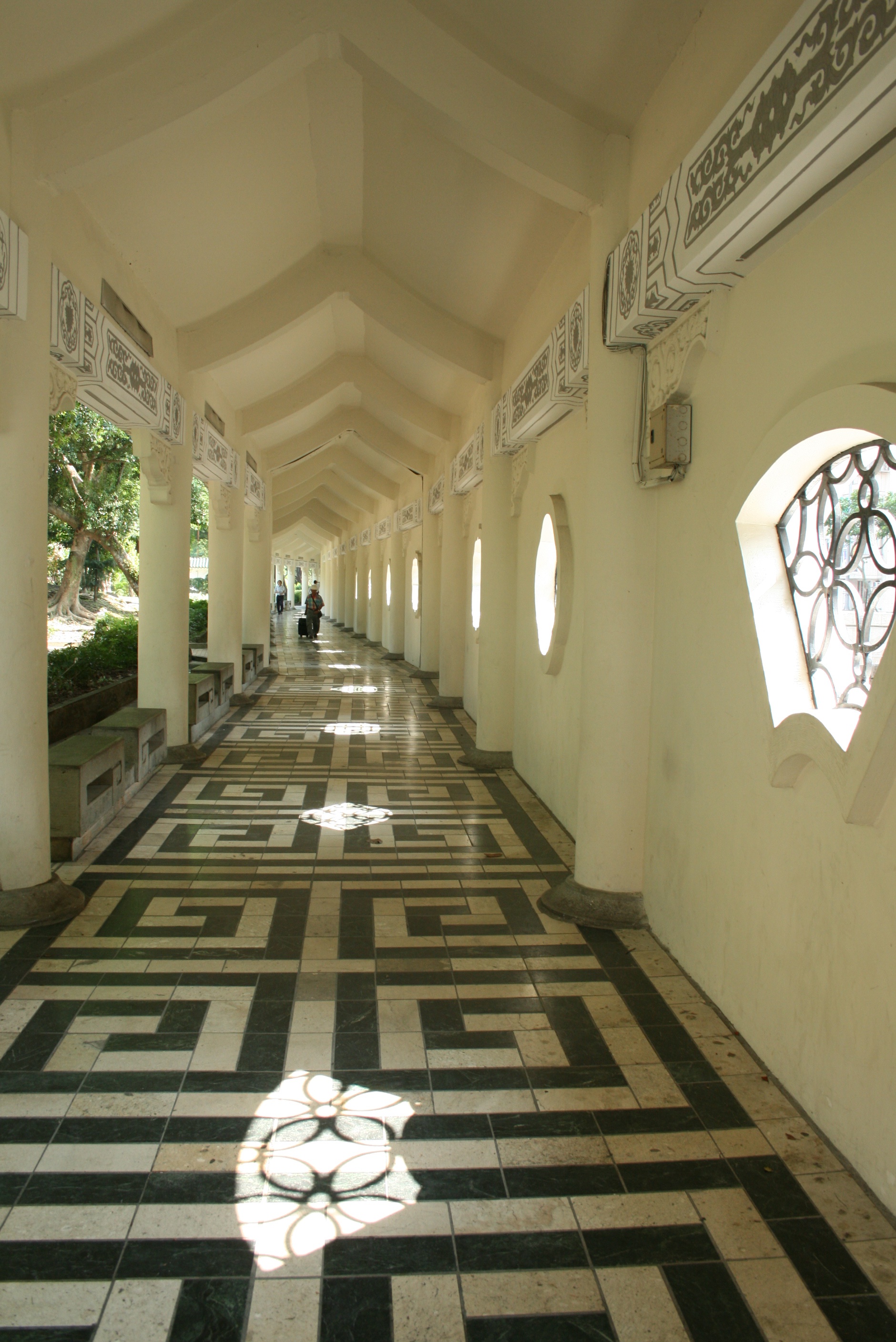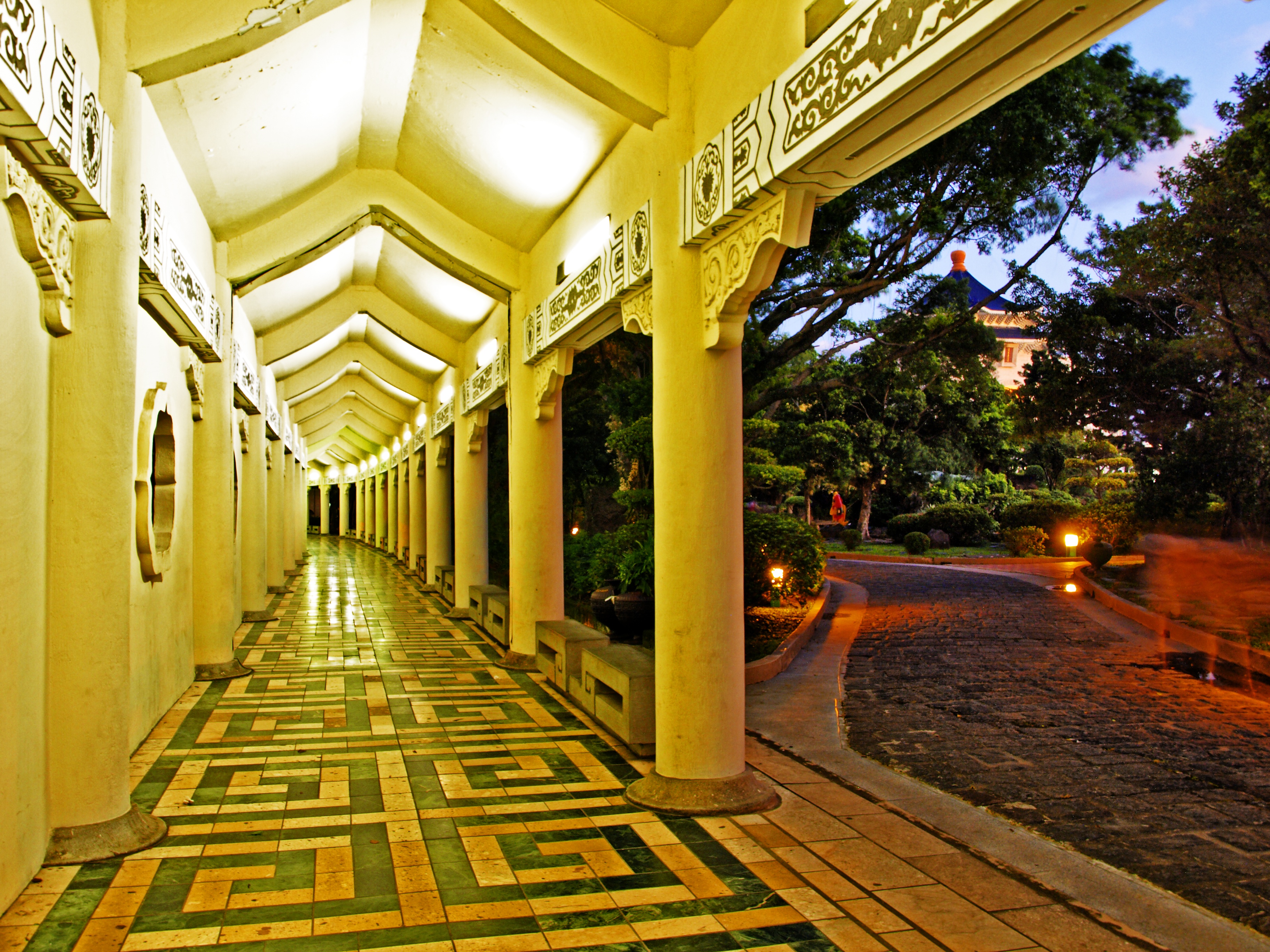 圍繞園區四周的迴廊,全長1200公尺、挑高5.5公尺,上方有寶藍色琉璃瓦的屋頂覆蓋,和紀念堂及各牌樓的屋頂相互輝映。 行走在迴廊間,可以欣賞屋樑上銀色的藻紋彩繪,在廊下的座椅休息時,透過形狀各異的美麗花窗,向外即可觀望信義路、杭州南路及愛國東路車水馬龍的景緻。 迴廊在夏天時可遮蔽陽光直射,下雨時則可供避雨,不時可見民眾在此下棋及練習樂器,為園區增添不少閒情逸致。