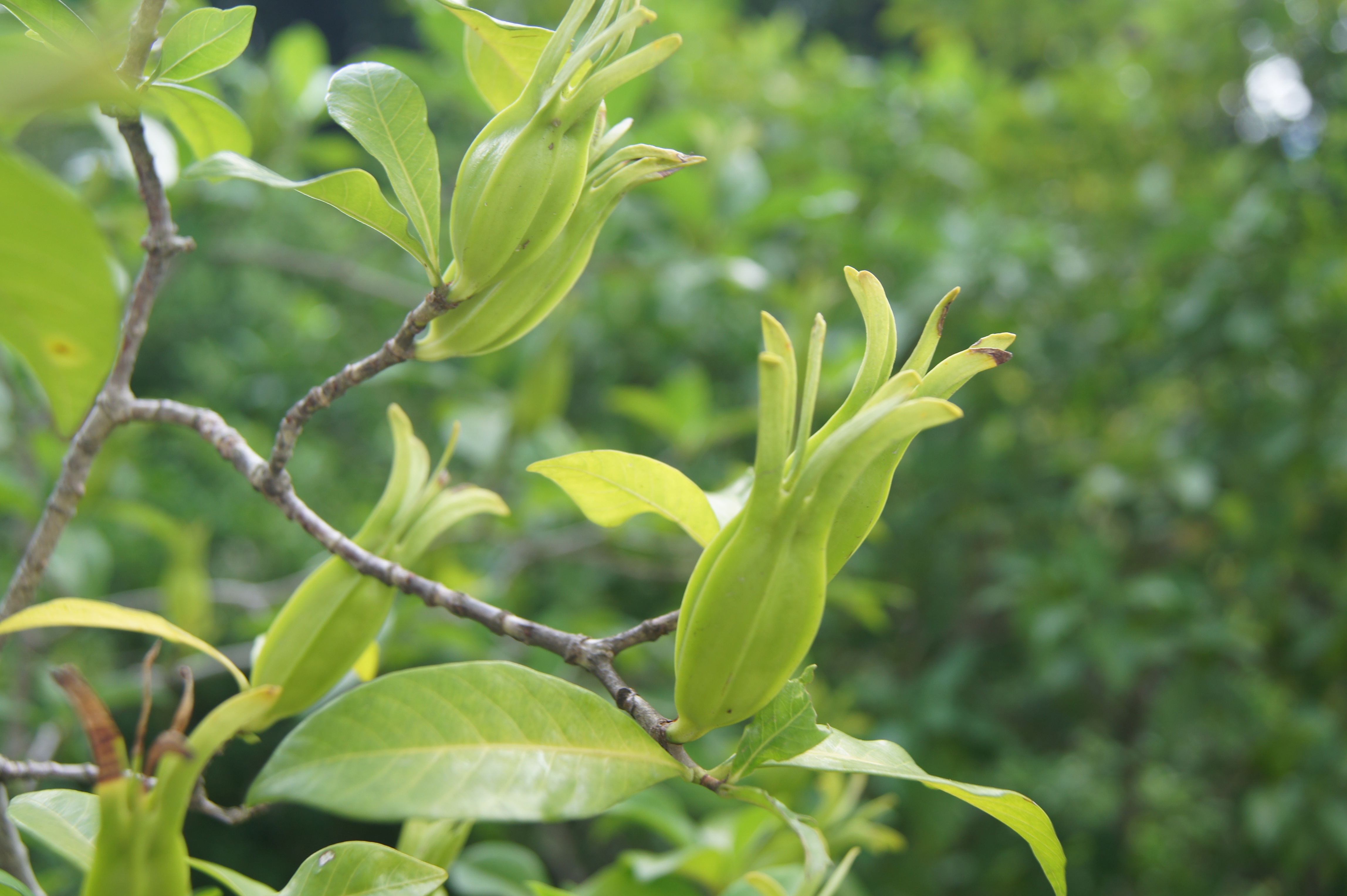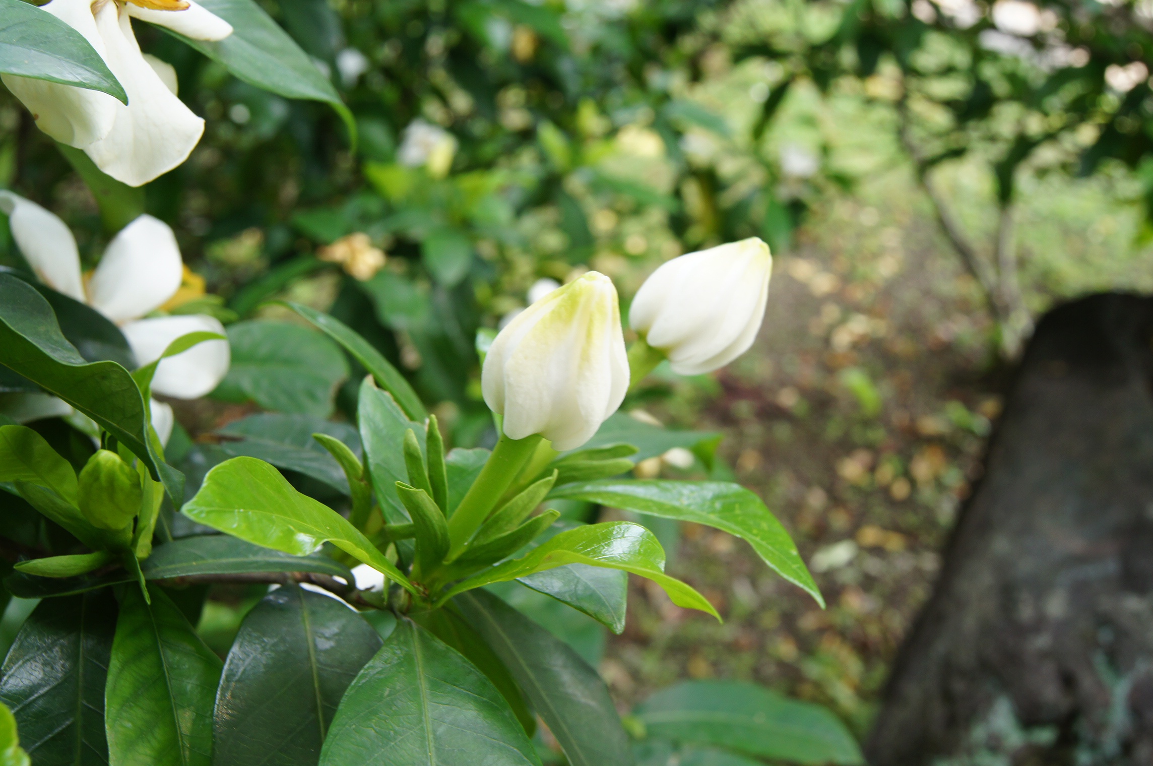 山黃梔為茜草科常綠灌木或小喬木,高約3 公尺。花香清雅。花期為春末至夏初,花初開時呈白色,花謝時漸轉為乳黃色。 果實含黃色素稱為藏紅花素,因作黃色染料而得名「黃梔」,是古老的天然染料以及食品著色劑。山黃梔的果實、成熟果乾、根、葉及花等部位,有清熱、解毒、散瘀等藥效。果實為綠底小灰蝶幼蟲的食物,小灰蝶媽媽會將卵產於果實凹陷處,幼蟲孵化後便會咬開果皮,進入果實內躲藏、取食果肉成長化蛹,羽化為成蟲後離開果實。