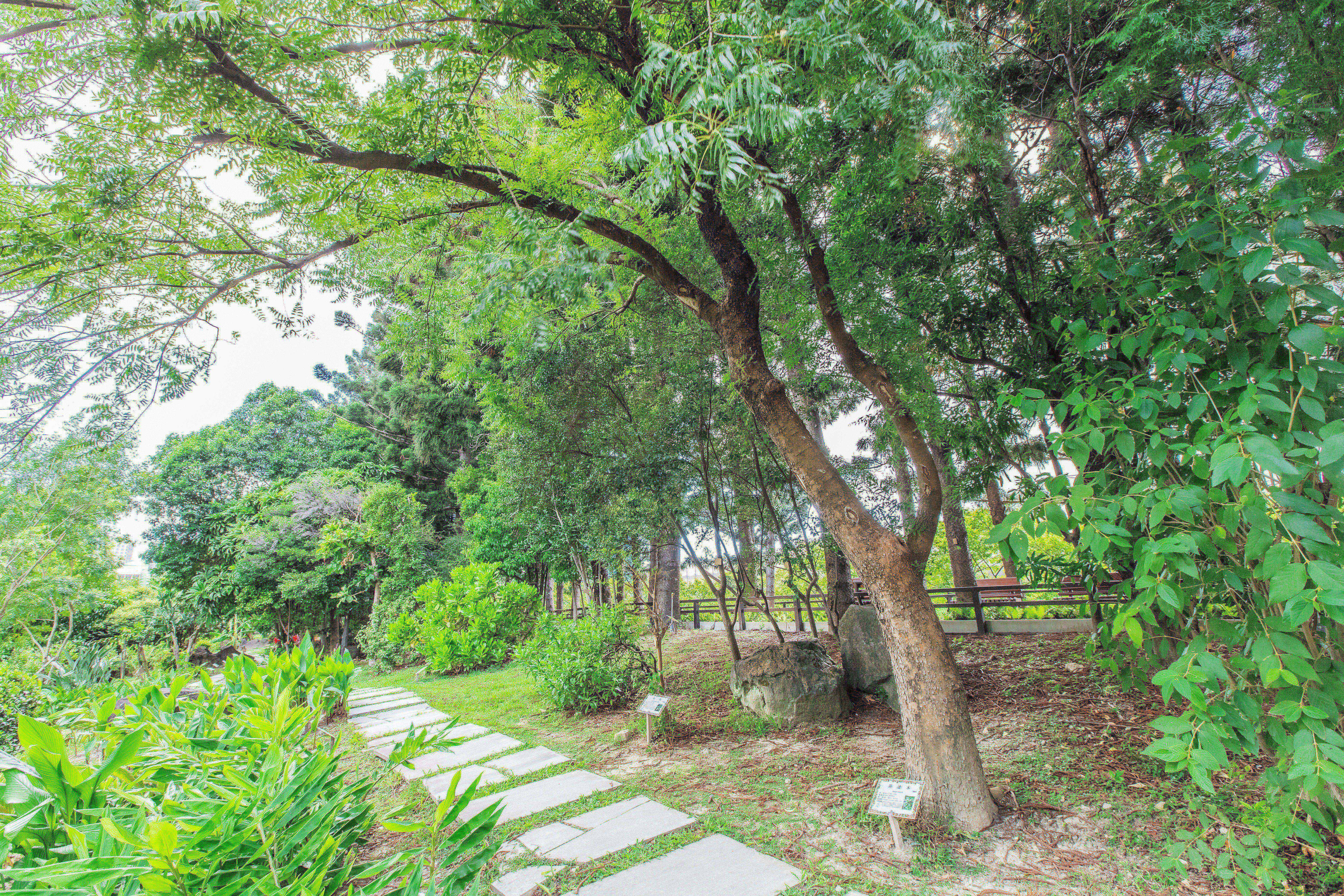 從大忠門、大孝門入口進來往主堂體後方走,你將進入種植多種臺灣原生種植物的虎背生態教學園區。這裡不僅作為教學、環境教育與休憩的場所,同時也提供野生動物覓食、棲息、繁殖的環境。生態園區依照植物的生長特性與屬性,分為臺灣原生植物、果樹植物及花卉植物3區,臺灣特有種約有20多種,包含北部少見的穗花棋盤腳、象牙木、蘭嶼羅漢松、楓港柿及蘭嶼肉桂等,可說是臺灣與離島植物生態的縮影。