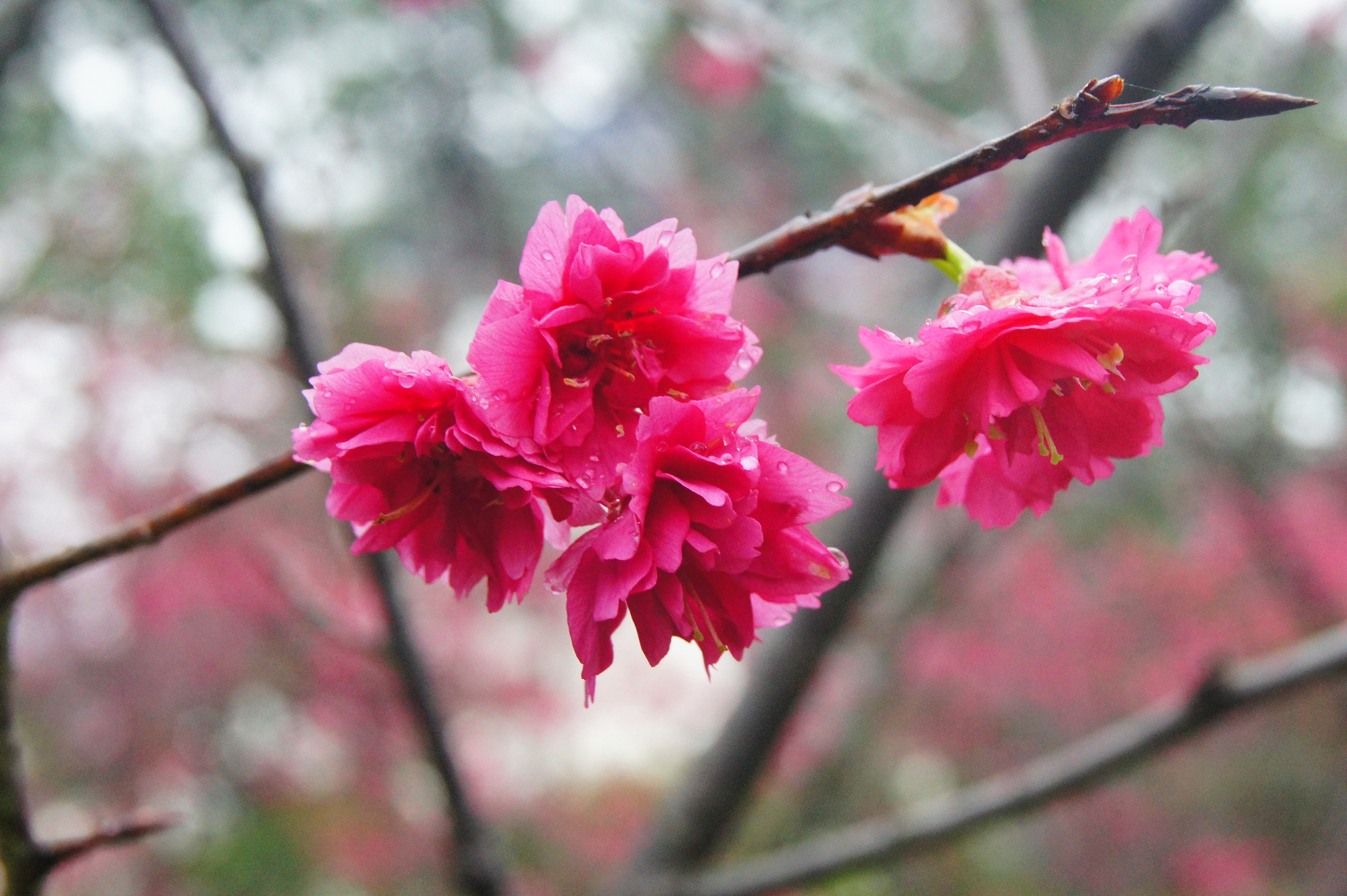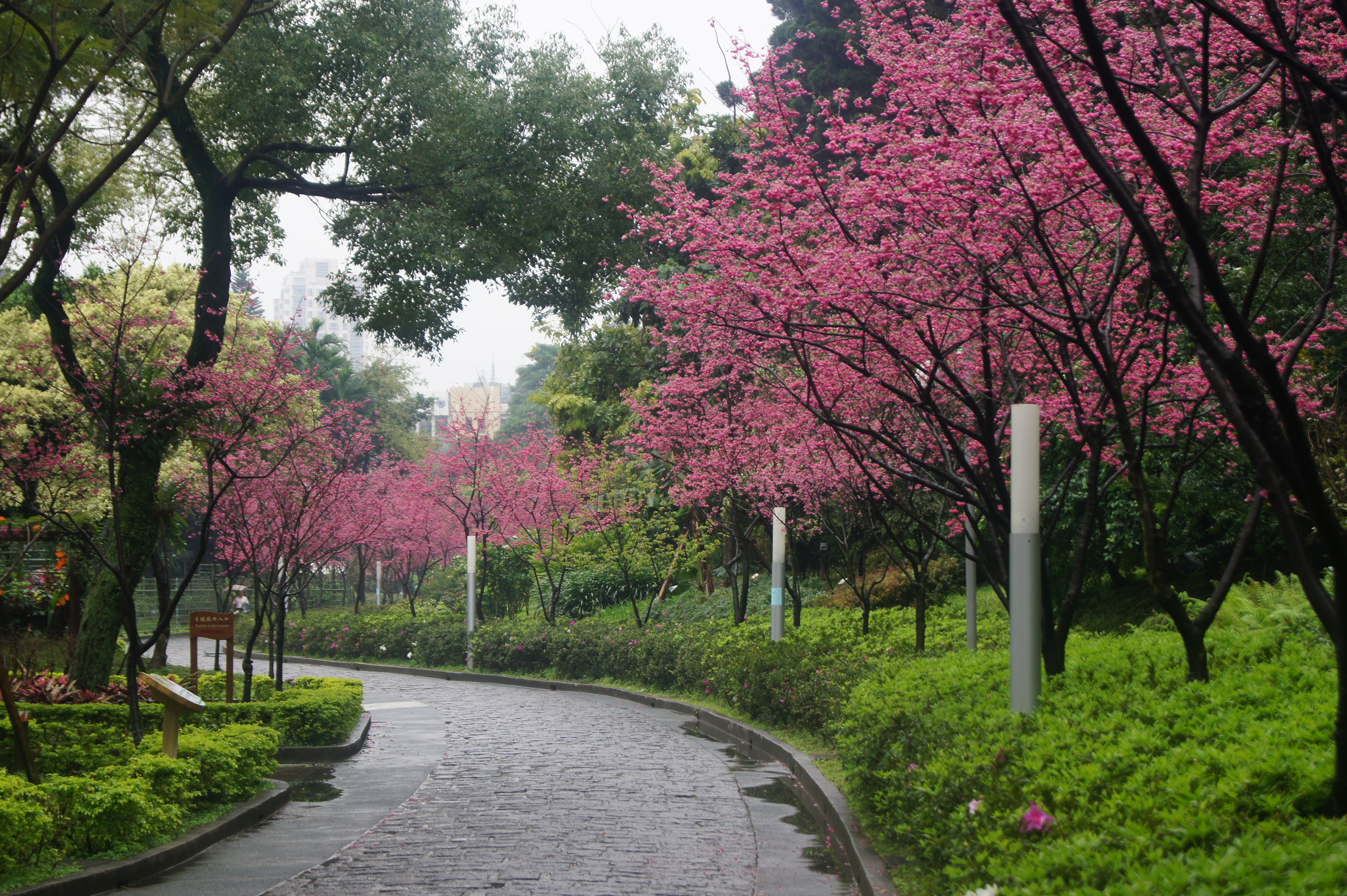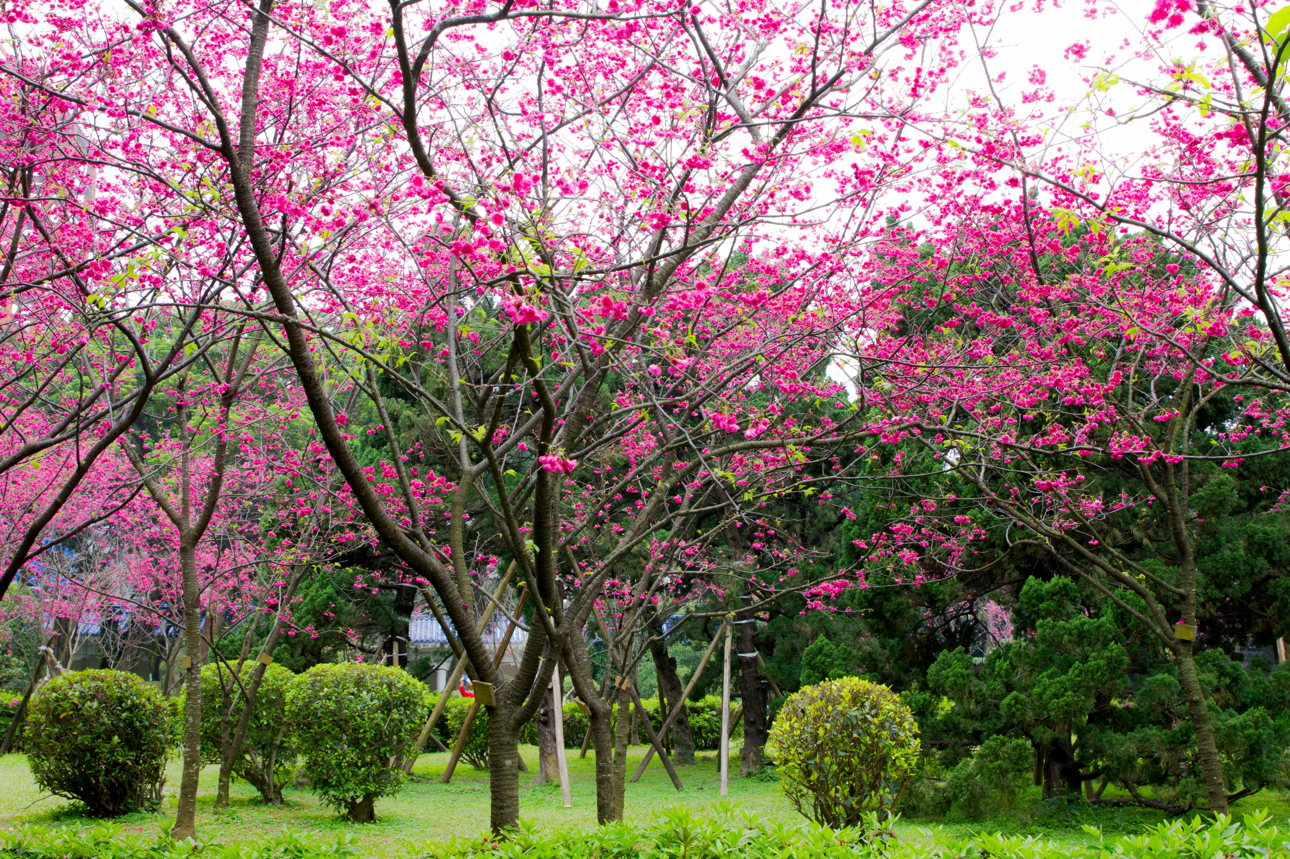八重櫻為落葉喬木,高度8-10公尺,主要種植於堂後步道。八重櫻和山櫻花一樣是花色偏紅、花朵茂密,只是山櫻花是單瓣,八重櫻是重瓣。由於重瓣花型像牡丹,所以又名牡丹櫻,但與日本的牡丹櫻是不同的品種。你知道如何分辨園區的櫻花嗎?花開時節是其中一個較為簡單的方式。以臺灣的天氣來說,八重櫻多在2月中下旬綻放,山櫻花則稍早便綻放。