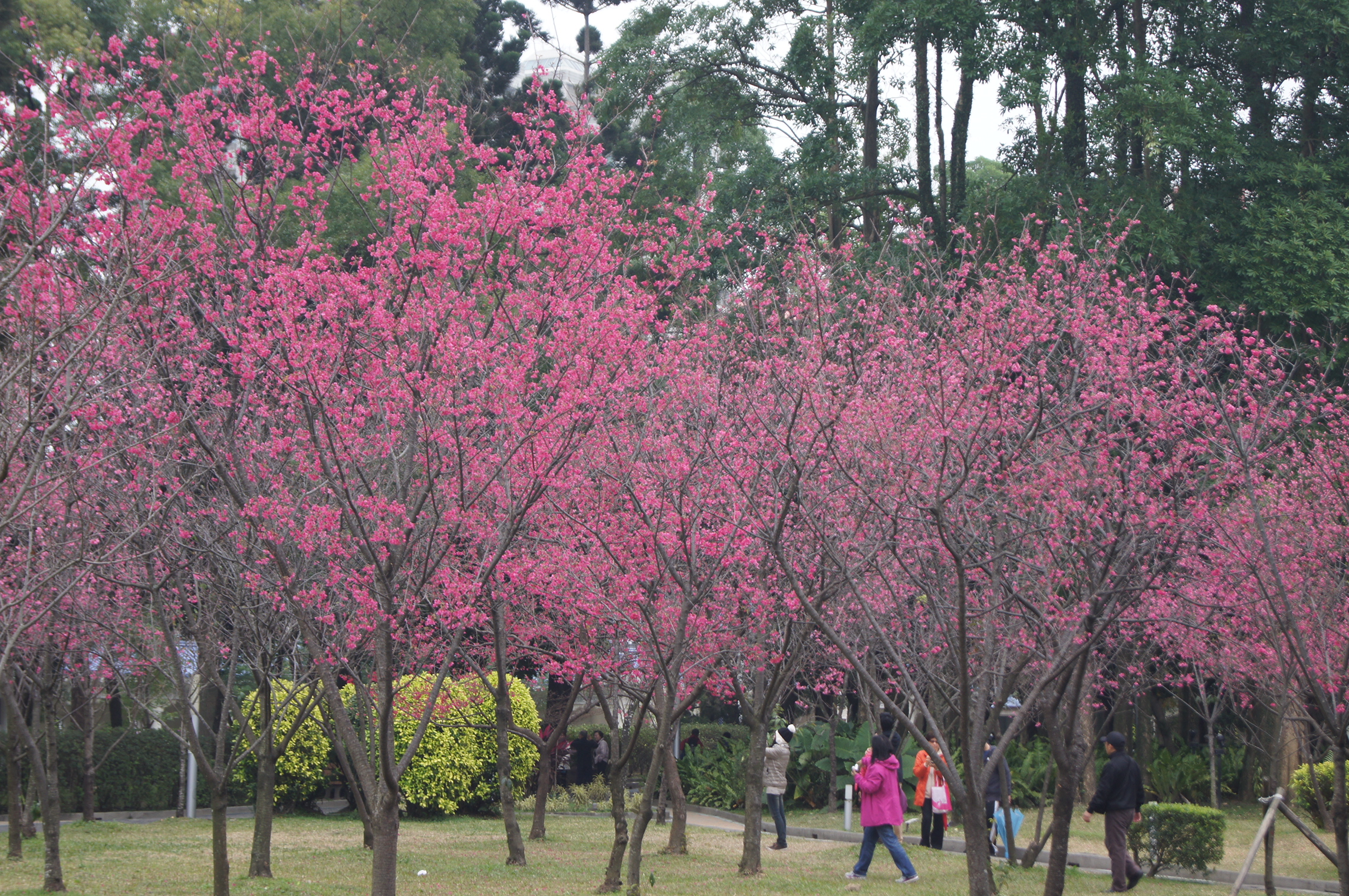 由主堂體往信義路、杭州南路角門的透水步道行走,來到園區的原生櫻花區。山櫻花是臺灣最具代表性的櫻花,又稱緋寒櫻,緋就是紅色,寒表示耐冷。目前在此區種植數十株山櫻花,平均高度約4公尺,每年約在1至2月時綻放,之後結果,成熟時呈暗紅色可食用(有澀味不適人類食用)。在臺灣多種植為庭園景觀造景與觀光地區搭配部分行道樹之用,生長較久之枝幹部表皮常呈片狀剝落,小枝條表面則光滑。
