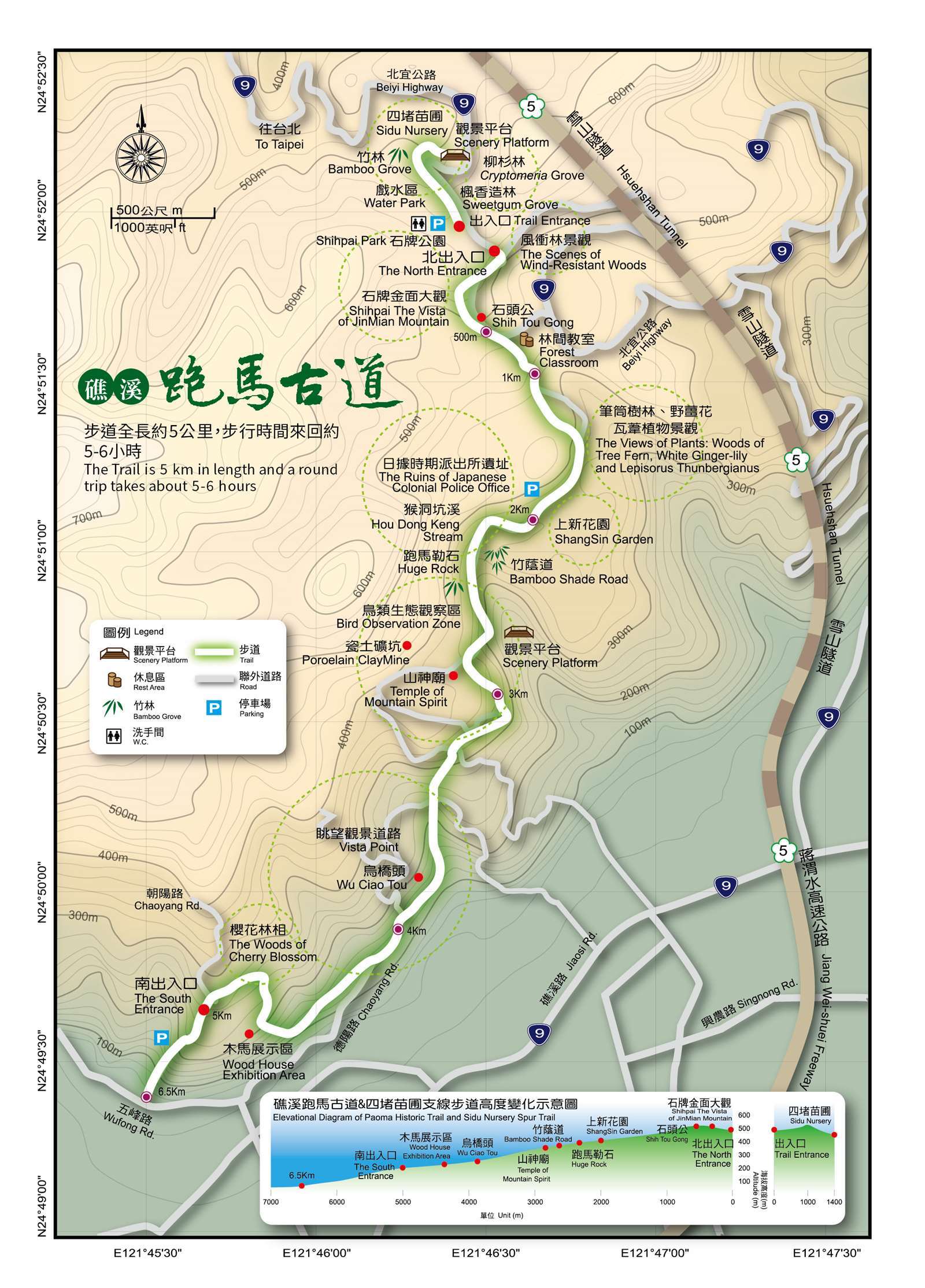 [開車前往]北段口:從北宜公路經坪過石牌於58.5K處進入。(石牌縣界公園)[開車前往]南段口:從濱海公路進礁溪市區往五峰旗風景區之右邊叉路進入。(甲乙級等大型車輛請於南入口處宜2線五峰路下車,後段為產業道路空間狹小無法迴轉。)[大眾運輸]搭乘火車及客運:於礁溪火車站下車後轉乘台灣好行礁溪線A線至跑馬古道站下車。(https://www.taiwantrip.com.tw/Frontend/Bustime/TimeTable/R0001)