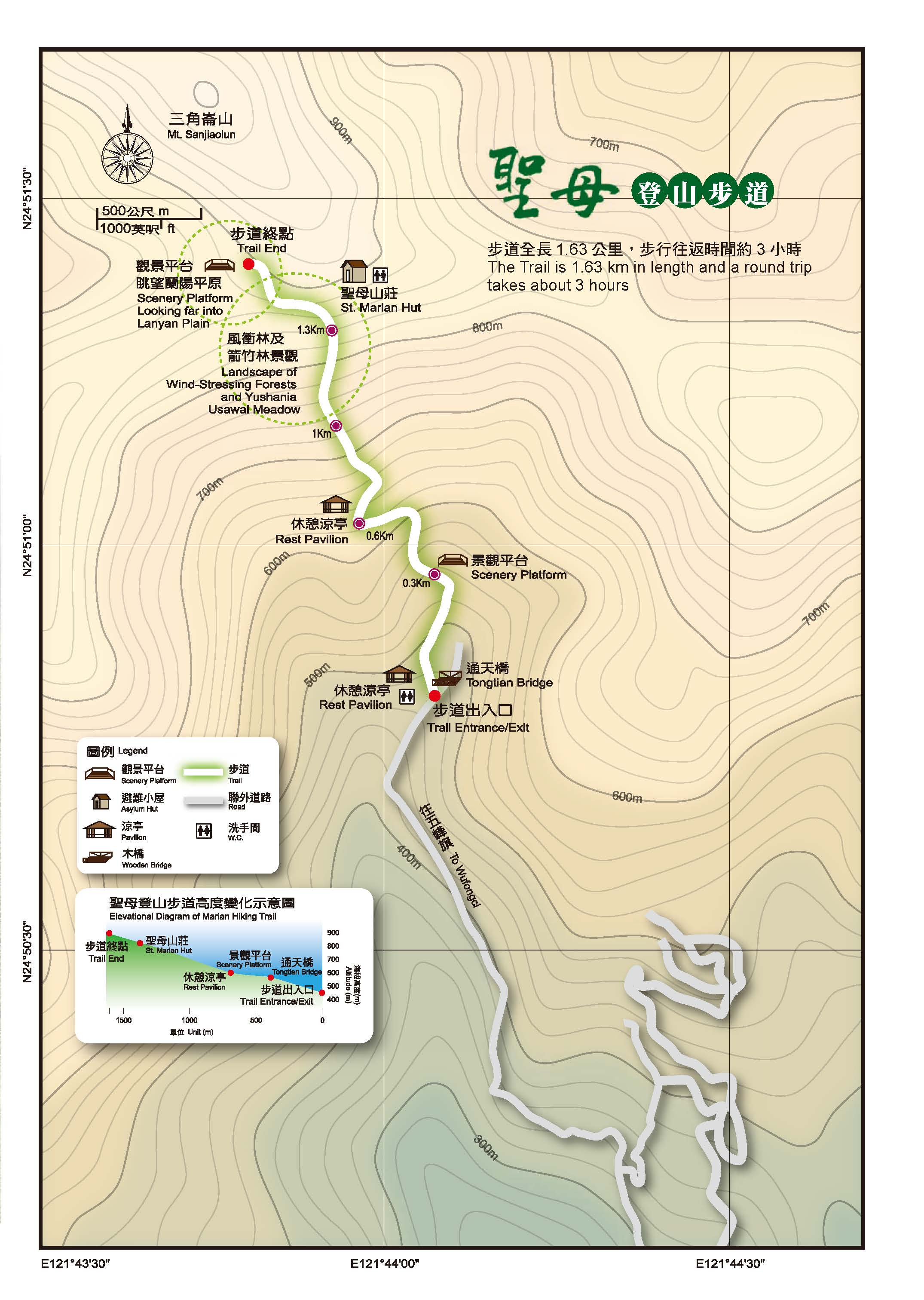 聖母登山步道位於宜蘭縣礁溪鄉五峰旗瀑布風景區上方,為天主教徒的朝聖之路,亦是前往蘭陽五岳之一的三角崙山之中繼站。終點的觀景平臺是宜蘭與臺北行政疆界,東臨蘭陽平原、西枕雪山山脈層巒疊翠;而稜線迎風面箭竹綠海隨風飄動、沙沙歌聲,美得讓人駐足忘返。
