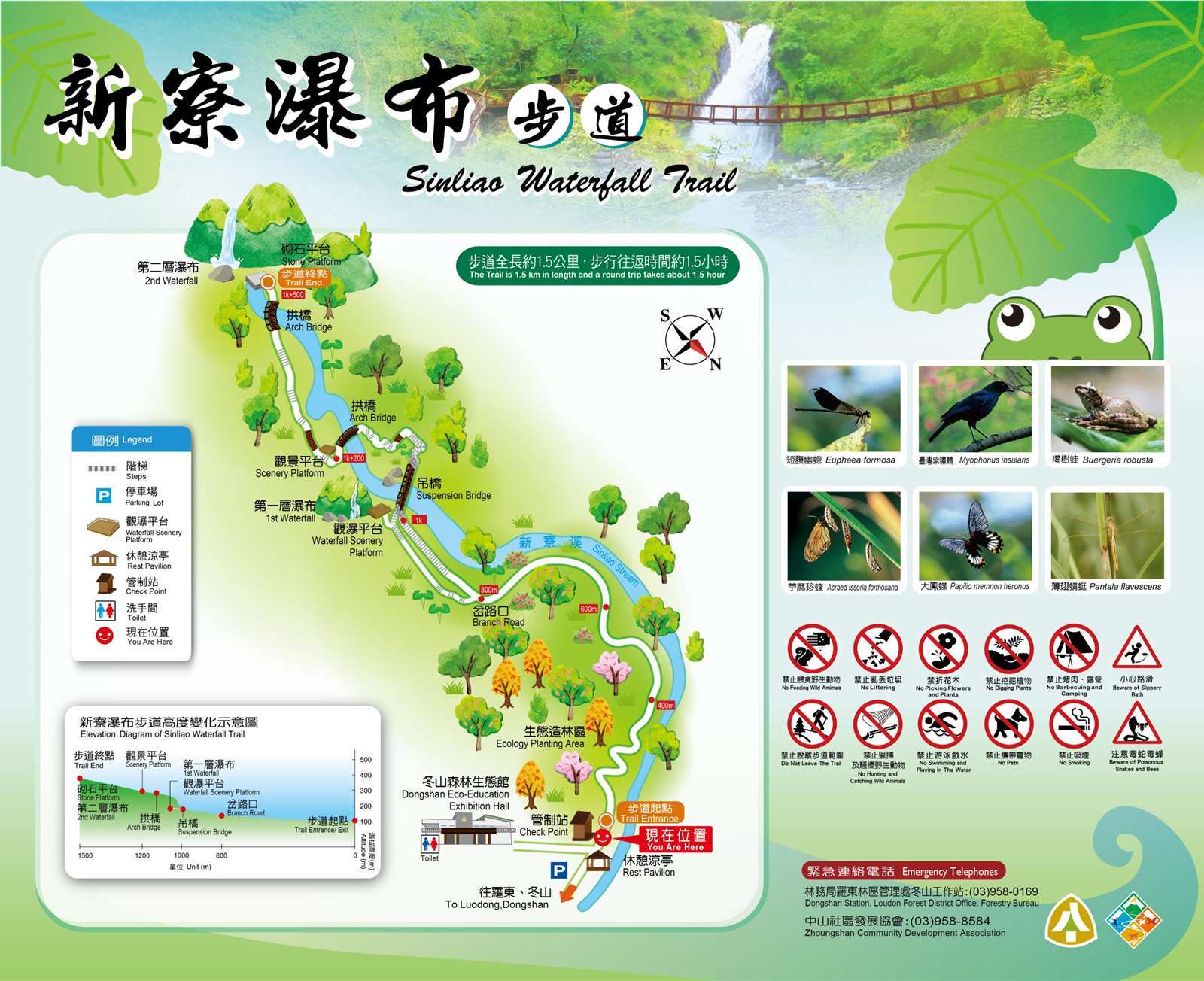 [開車前往]國道5號:由羅東交流道下往羅東市區;經環鎮道路(光榮路)左轉前行,至義成路三段左轉往丸山方向,直走到底→T字路右轉直走(往中山休閒農業區方向)至新寮路左轉直行到底即可到達。[開車前往]省道台9線:由宜蘭市往南經省道台九線循羅東市區環鎮道路(純精路)南行,再右轉義成路三段,直走到底→T字路右轉直走(往中山休閒農業區方向)至新寮路左轉直行到底即可到達。[大眾運輸]羅東轉運站-仁山植物園站:羅東轉運站搭281線公車至仁山植物園站下車,步行2.2公里可達步道口