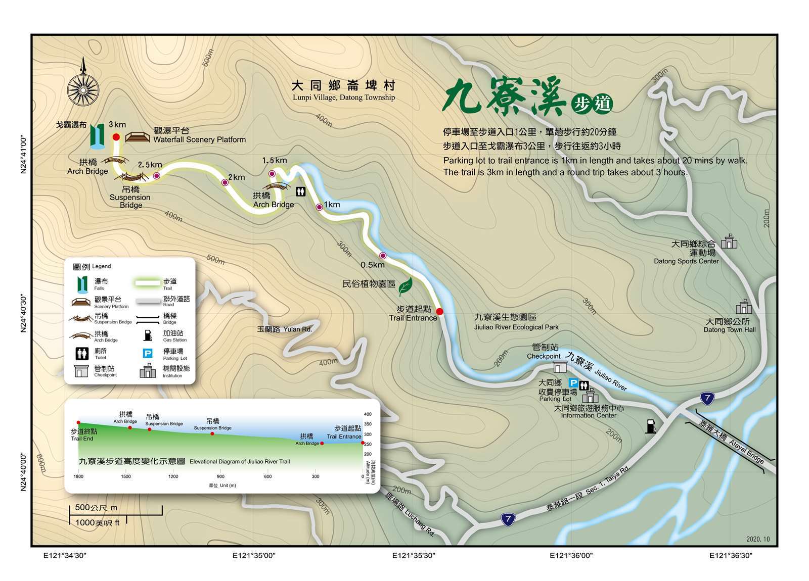 步道傍溪而行,終年溫暖潮濕。九寮溪由源自於雪山山脈拳頭姆山下的野溪匯集而成,水量充沛,溪水清澈,水溫近乎冷泉,流經多處斷層形成壯觀宏偉的飛瀑。步道入口位於大同鄉公所管轄九寮溪生態園區,步道全線為平坦土石路,輕鬆好走直達瀑布,林蔭茂密、附生植物及蕨類繁盛。