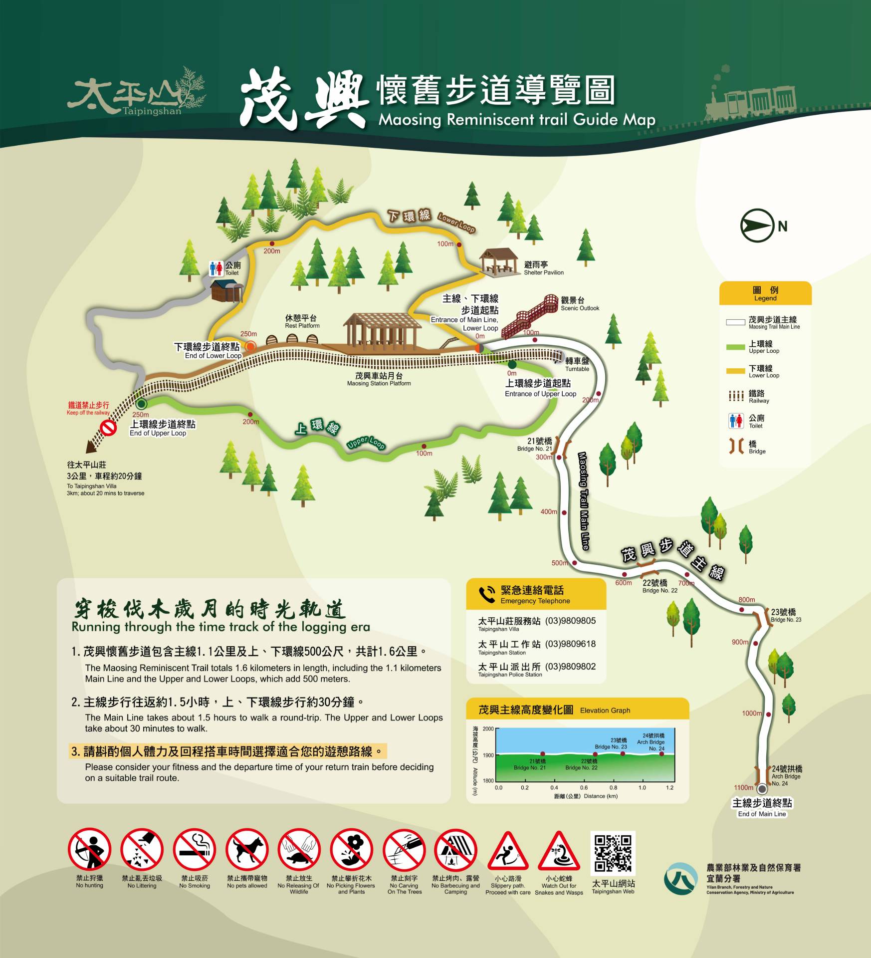 茂興懷舊步道起點為太平山蹦蹦車茂興月臺站,沿舊蹦蹦車軌道整建,坡度平緩,全程有完善的休憩設施與導覽解說牌,遊客可選擇步道主線、上環線、下環線不同的路線搭配。這條日治時期興建的「古運材軌道」,蜿蜒於紅檜、臺灣扁柏、柳杉林間,步道兩旁則滿佈著耐溼蔭的小林木、蕨類與地被植物;沿途穿過林間、繞過山壁、越過水澗,而古樸的鐵軌與工寮遺跡則見證太平山林木盛產的歲月。