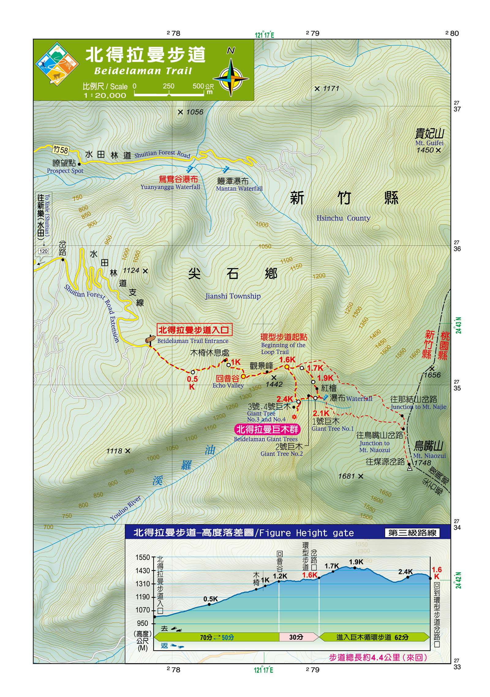 [開車前往]120縣道往新樂方向,轉進水田林道(竹58):國道3號竹林交流道下,從新竹尖石走120縣道往新樂方向,過新樂大橋轉進水田林道(竹58),過水田橋右轉進水田林道支線抵達水田部落,取左往上水田部落,經源昇園商店(舊稱北得拉曼補給站),續行可抵達步道登山口。