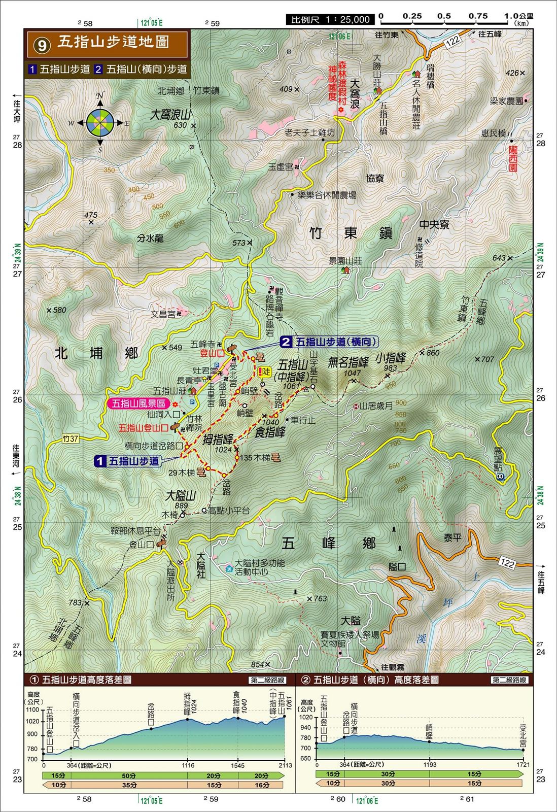 五指山由五座山頭相連並列,宛如五指而得名,在清朝即享有盛名,「淡水廳志」中以「指峰凌霄」來形容山勢險要壯觀,並列為八景之一:日治時期被票選為全台風景十二勝之一。步道沿途遍植柳杉,綠意盎然,林景幽雅,因山勢俊秀靈奇,所以建有許多廟宇,雲光寺、玉皇宮及觀音禪寺等。山頂視野遼闊,峨眉、北埔、新竹、竹北等盡收眼底。