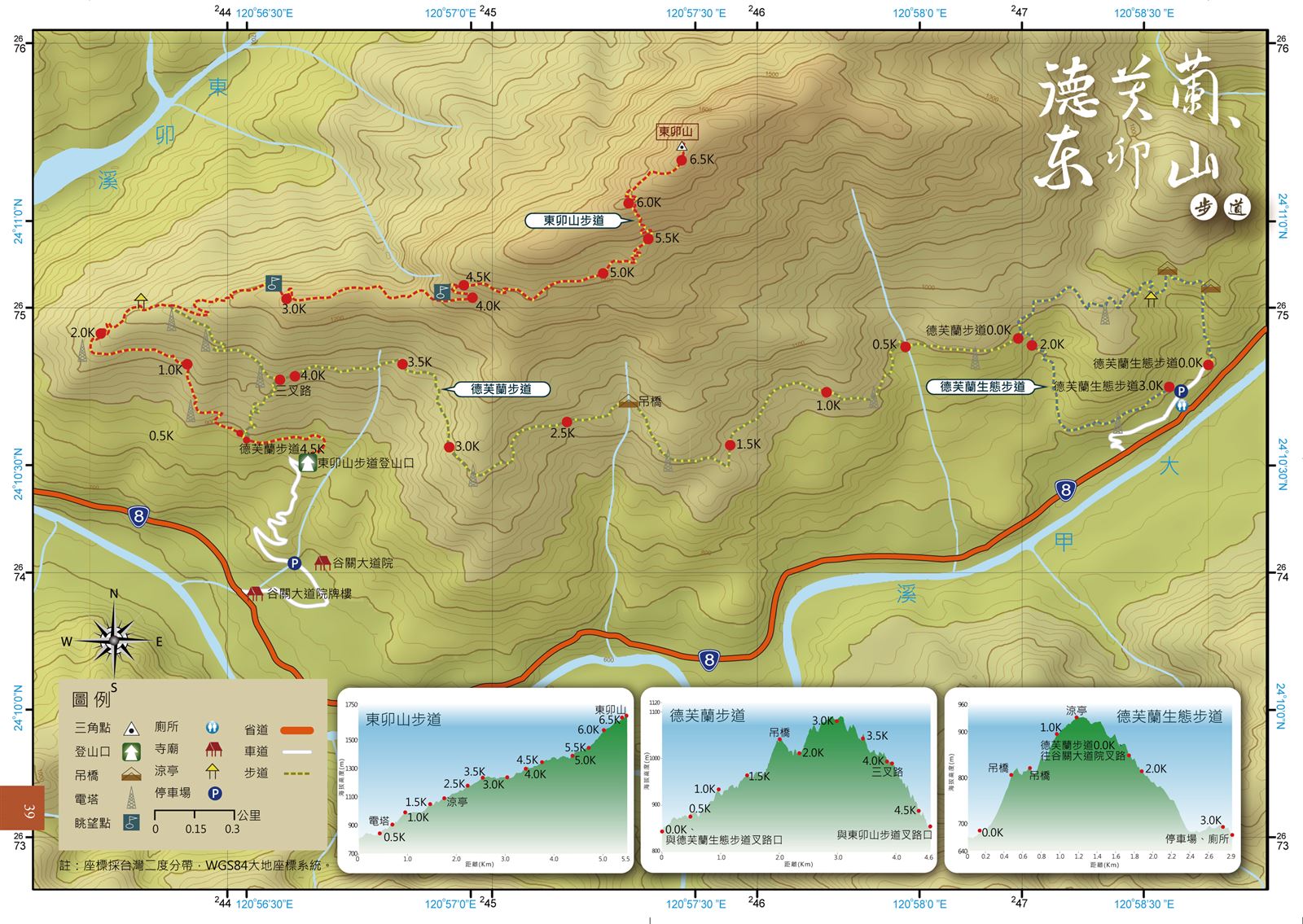 德芙蘭步道位於博愛村松鶴德芙蘭部落後山附近,步行約3小時。步道大部分路段為台電保線道路,沿著東卯山東南面大崩壁裙裾修建,東臨大甲溪;沿途可見陡峭的大岩壁及散落的大、小落岩塊,步道上偶有大石堆疊,得手腳並用攀爬而上;而就地取材的石階,古意盎然。步道沿途可見大葉楠、櫸木及茄苳巨木,還有粗壯的爬藤植物,是步道最大的特色。