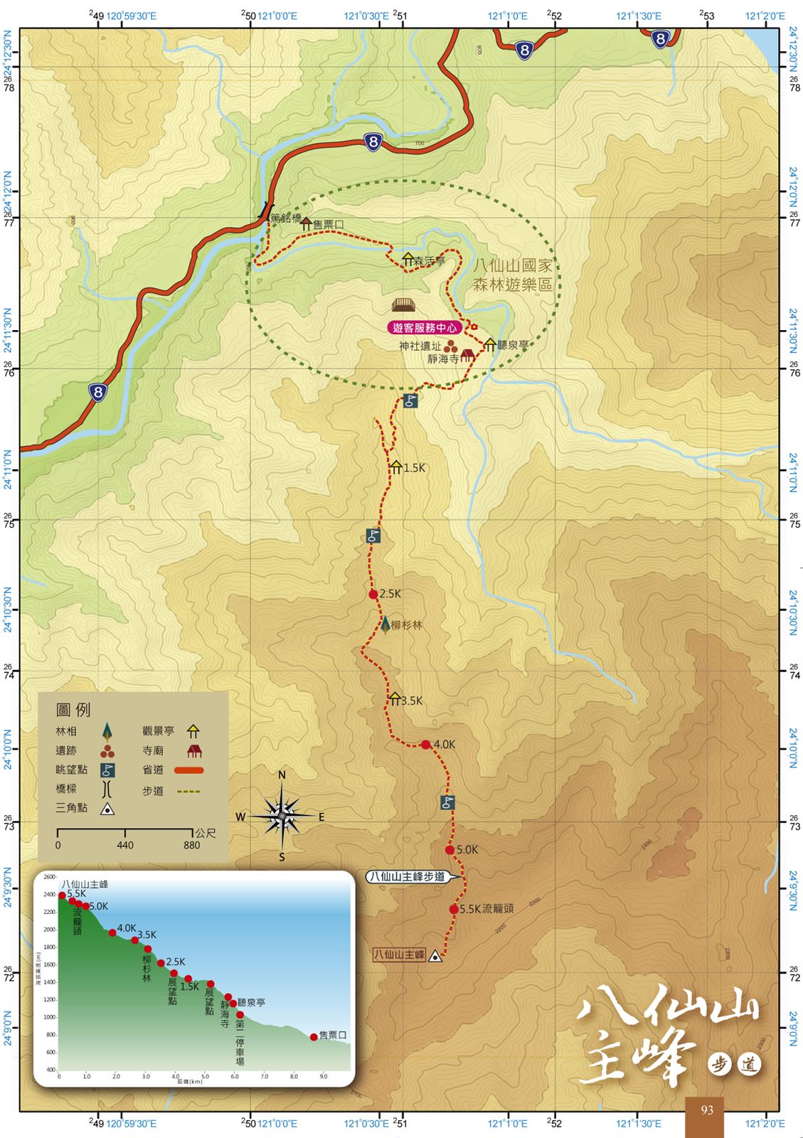 八仙山因海拔約八千日尺,原擬名「八千山」,之後以較典雅的「八仙山」名之,為谷關七雄之首,以健行的步伐來回約需8小時,步道前半段坡度較陡,上了稜線後較為平緩,全程走在林蔭中,植被由常綠闊葉林進入四季變化明顯的針闊葉混合林,四季景色繽紛多變。