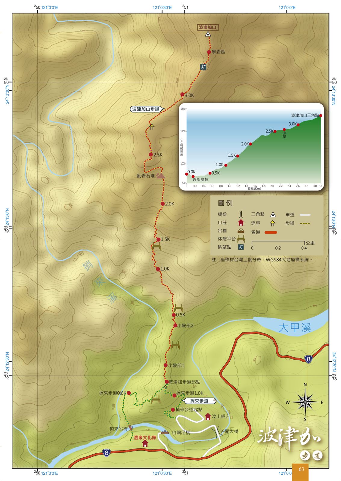 波津加步道位於大甲溪北岸,在谷關七雄中排行第四,昔日為台電保線道路,林徑旁仍能見到倒臥的老舊木製電桿及固定用鋼索。「波津加」名稱的由來據說是因步道坡度陡峭,許多登山者形容其「坡真陡」(閩南語諧音)。由於高低差約1千公尺,全段幾乎都在爬升,來回時間需7~8小時。