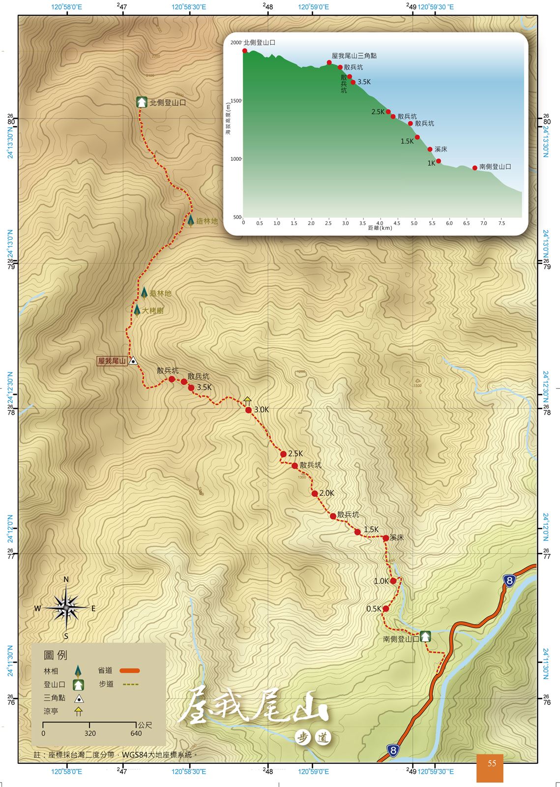屋我尾山位於大甲溪北岸,為谷關七雄中的老三。步道沿路環境多樣,有杜鵑林,稜線上矮密的風衝林、杉木造林地、針闊混合林與楠櫟林;林下潮濕的枯枝倒木與落葉層上有著成簇之蕈叢。天氣晴朗時,從步道的破空處可遠眺周圍群山。
