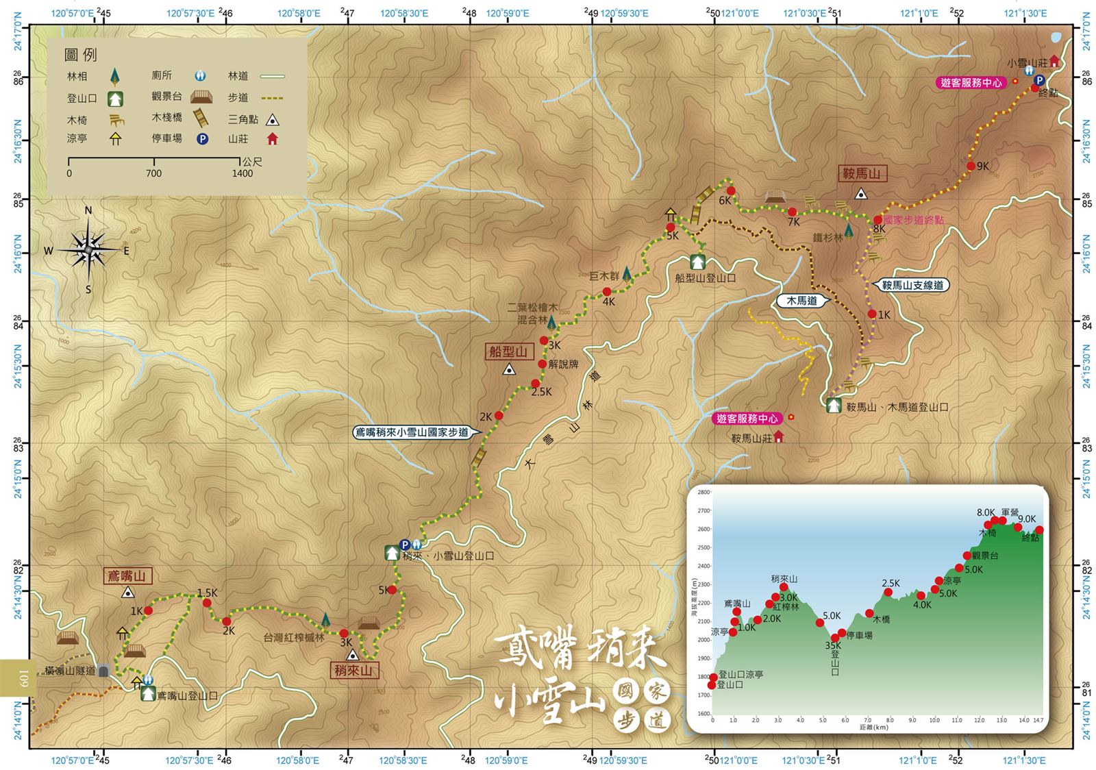 鳶嘴稍來國家步道為中部地區中海拔熱門登山路線,鳶嘴山、稍來山是可以分開走的兩條步道,其中鳶嘴山以險峻危崖出名,而稍來山以秋天滿佈的台灣紅榨槭為名,兩山連走沿途峭壁綿延、景觀秀麗。 船型山、鞍馬山位於大雪山森林遊樂區內,雪山山脈中末段稜脊,由稍來小雪山國家步道串連,從35.2k收票亭附近登山口起登,至49k小雪山旅遊資訊站停車場,本路段長約10公里。