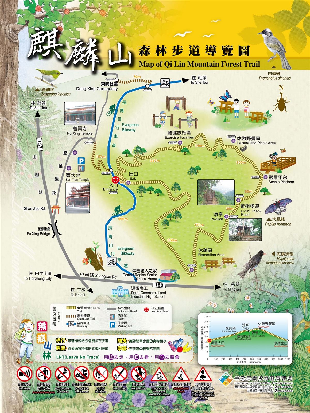 麒麟山森林步道位於彰化縣田中鎮贊天宮與普興寺的後方,由南投縣分署採自然工法整建而成,施工時刻意保留原有的大樹,從左右繞道而行,成了饒富趣味與巧思的離樹棧道。 沿途設有多處觀景平台、涼亭和露天體能設施,綠樹成蔭、景致優美,木棧道左鄰深壑、右望山谷,稜線上視野遼闊,能欣賞到南側壯觀的相思樹海和惡地地形的峭壁與深谷,西邊可俯瞰田中市區與彰化平原風光。 全程起伏落差不大,可一邊運動一邊賞景環繞一圈、返回起點,適合全家老小戶外踏青、扶老攜幼同遊山林。