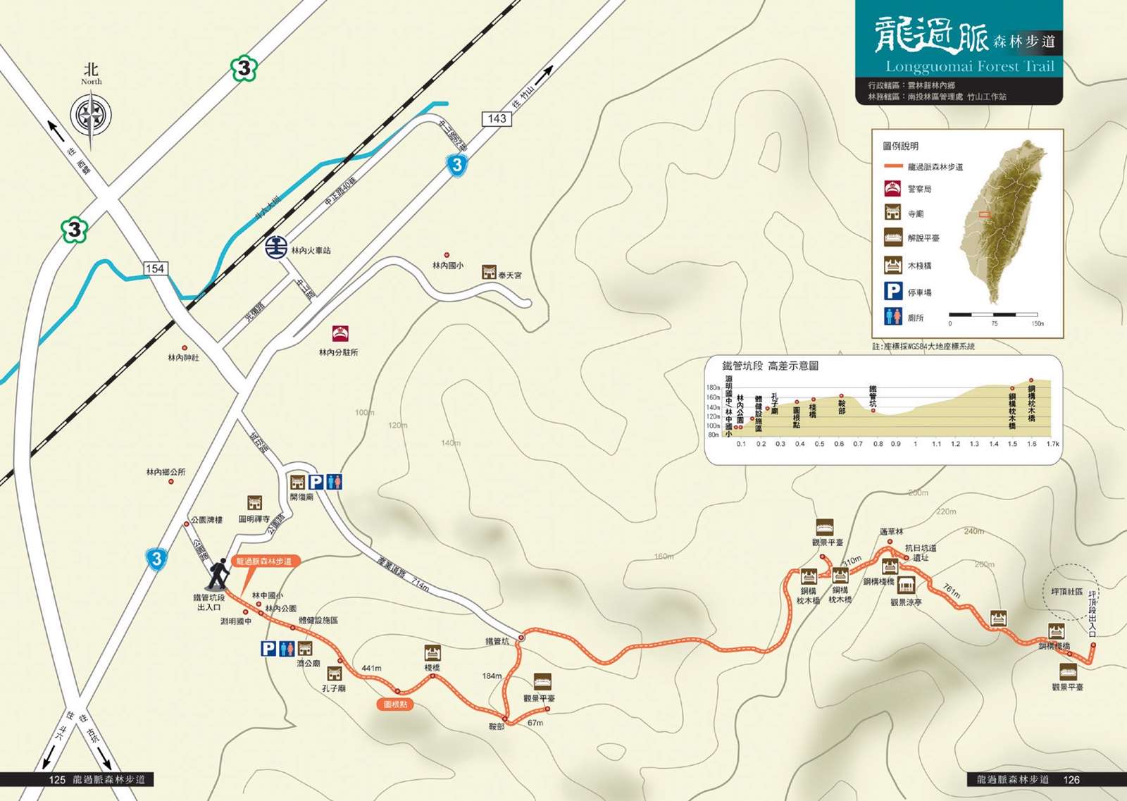 龍過脈森林步道串連林內鄉的林中、林南及坪頂三村。林內山脈和草嶺、南投縣竹山鎮的層峰疊延,與觸口山、東甲山相連,相傳從草嶺、竹山交界處往低山俯瞰,林內境內山脈稜線狀似一條龍的背脊,到濁水溪與清水溪交會口時,又像是龍汲水,因此得名「龍過脈」。步道有豐富多元的自然與人文景觀。 從鐵管坑段入口進入,首先經過林內公園,公園的前身是神社,因此有鳥居靜靜矗立。 登上龍脊,稜線上的展望很好,可眺望雲林地區,也可以看見八卦山山脈。下稜線進入林蔭間,天然的低海拔次生林生態資源相當豐富,可能會遇到大冠鷲和台灣獼猴,或是珍貴的八色鳥。春天時可以遇見美麗的紫斑蝶群。這條龍平易近人,兼具人文歷史和自然美景,適合親子同遊。