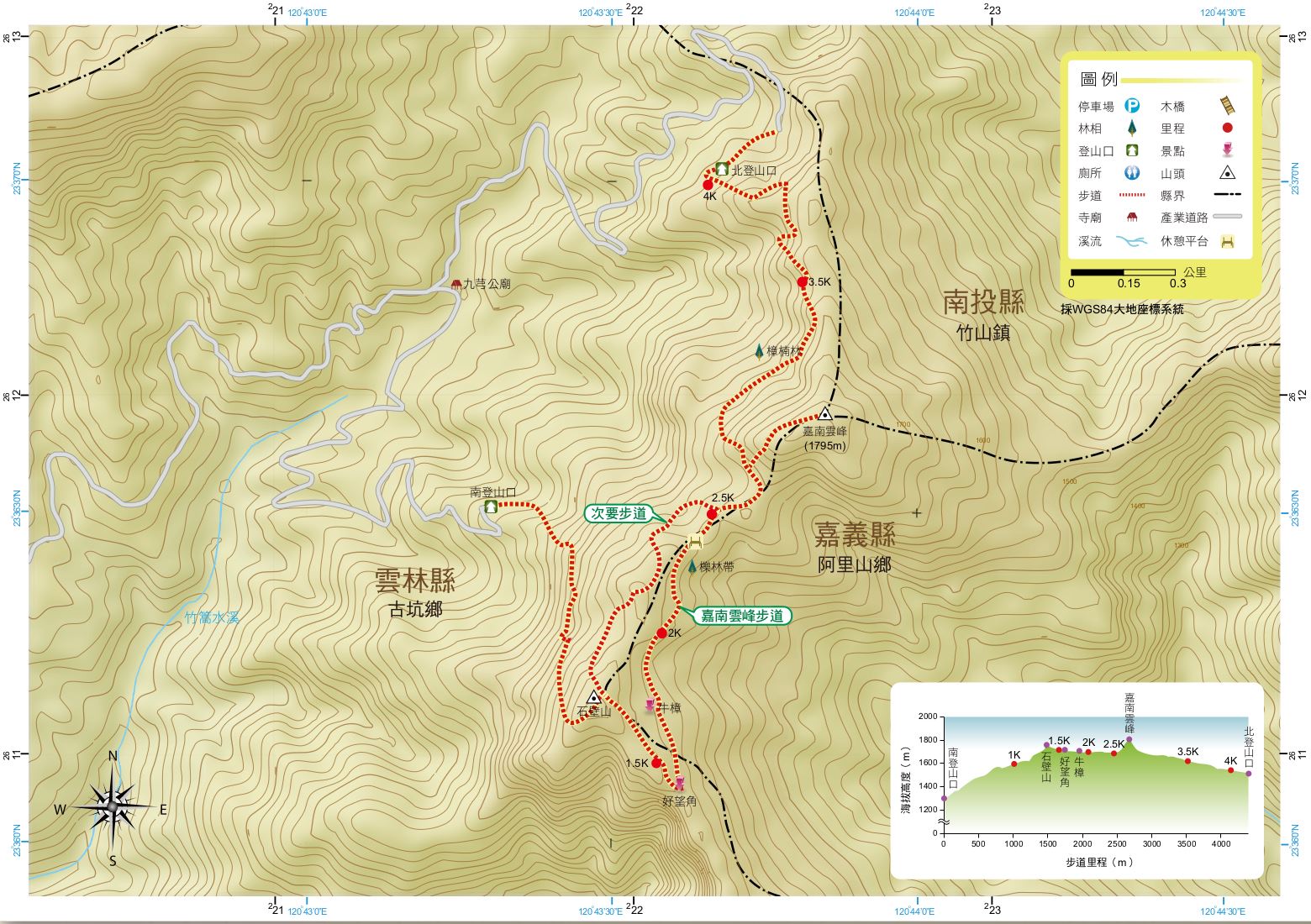 因位於嘉義、南投、雲林三縣交界故名「嘉南雲峰」。翠綠的孟宗竹林,十分優美,全程幾乎曬不到太陽,石壁山及好望角視野極佳,展望層疊的山巒,蜿蜒曲折的清水溪。