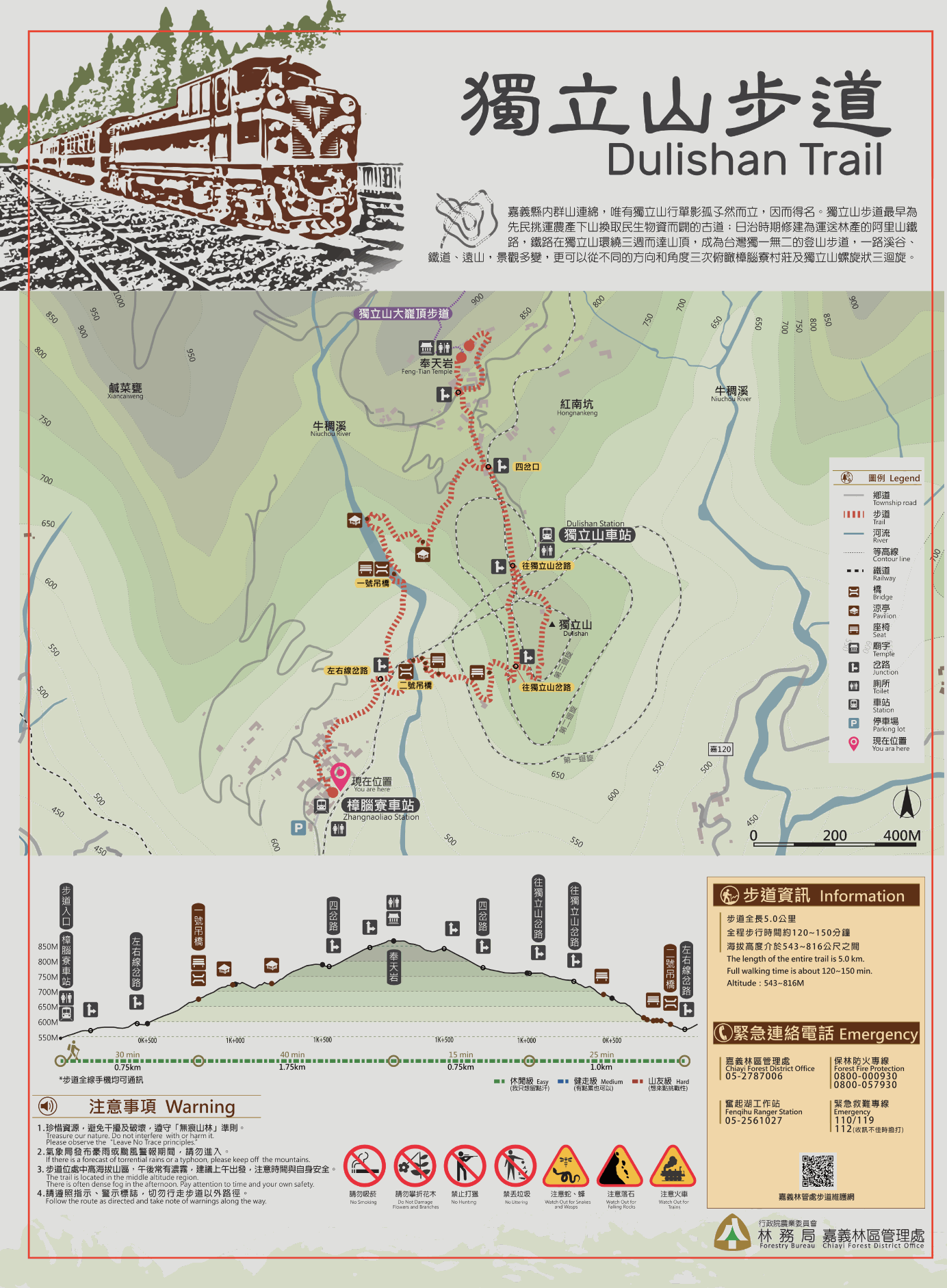 嘉義縣內群山連綿,唯有獨立山行單影孤,孑然而立,因而得名。獨立山步道前身為獨立山古道,最早為先民運送山下日常必需物品至山區而闢的古道。日治時期為運送林產而修建阿里山鐵路,在獨立山環繞三週而達山頂。 獨立山古道規劃為獨立山國家步道,難易度低,適合親子共遊。沿途可見溪谷、鐵道、隧道、吊橋,景觀多變。螺旋三次而上的鐵道更是特有的景觀。