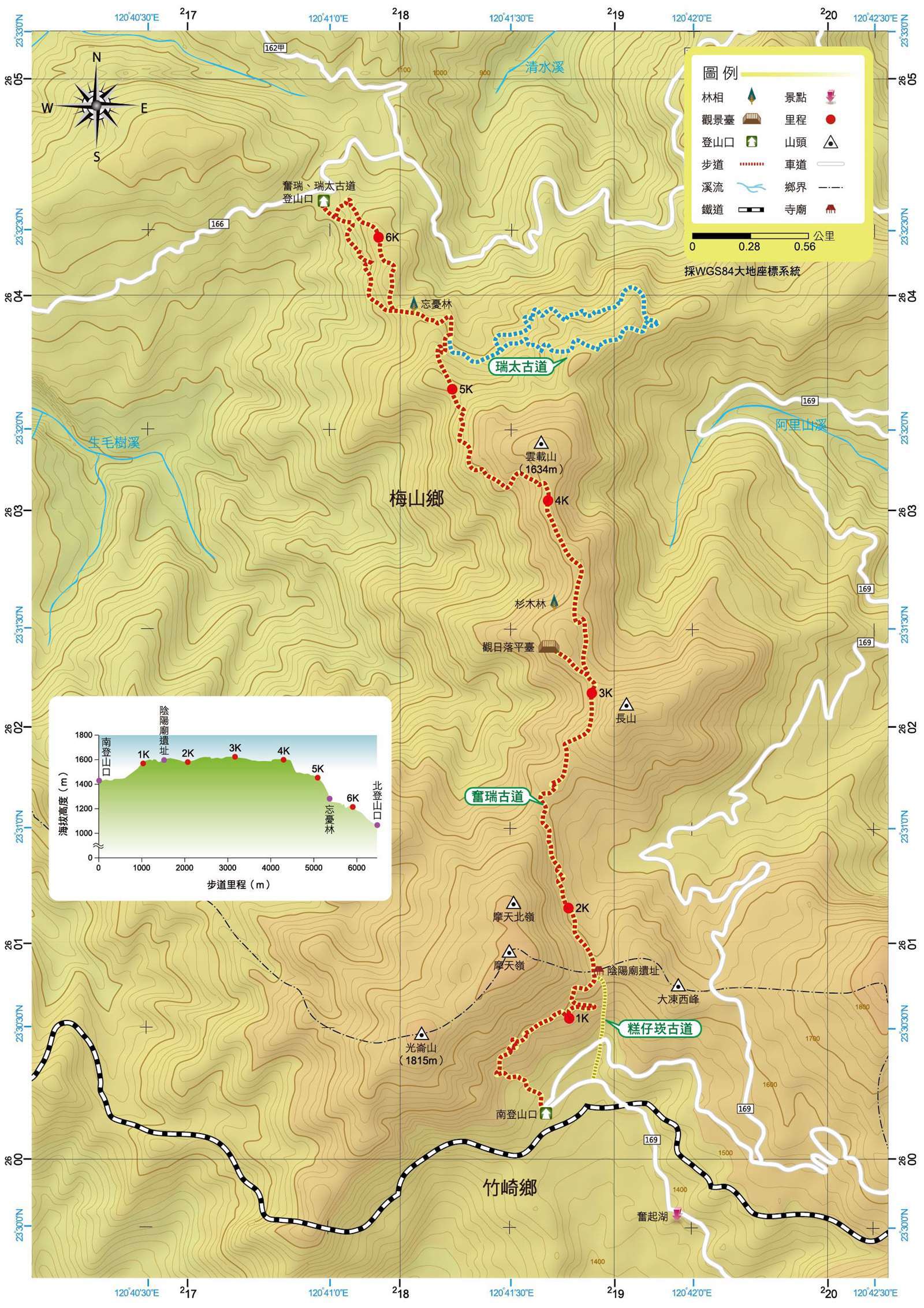 奮瑞古道銜接奮起湖和瑞里兩處著名風景區,清朝時期先民挑擔往來通商,至今仍保存悶柴窯的遺跡、陰陽廟、神社等遺址。步道自火車站前紅磚階道而上,銜接環村生態步道與巨木山徑,後接奮太及瑞太古道,一路上在茂密原始林與孟宗竹林間穿梭,沿途還有參天聳立、丰姿互異的櫧櫟巨木群。