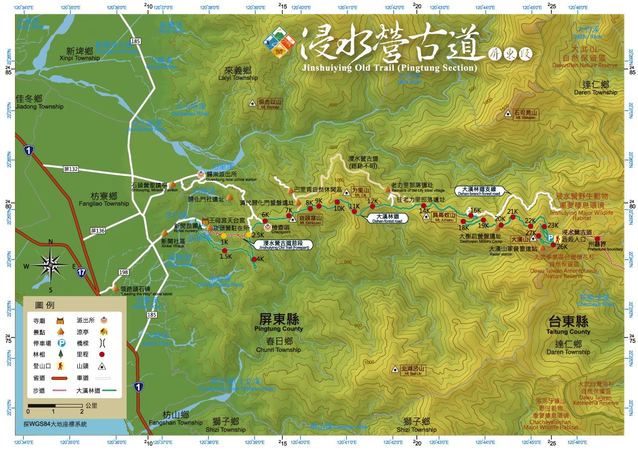 入口位於大漢林道約23.6k,至州廳界間,約2.7公里為浸水營步道(西段)。在104年間經屏東縣政府依文化資產保存法公告為文化景觀。