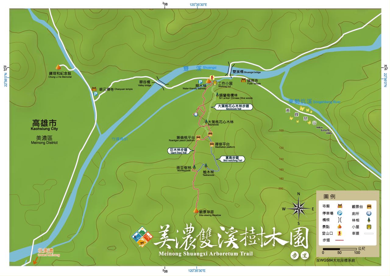 雙溪樹木園位於美濃區東北隅的廣林里,鄰近著名的黃蝶翠谷,為美濃溪上游,由二溪匯流包圍而得名,前身為1935年日人設立的「竹頭角熱帶樹木園」,面積達7.56公頃,引進、搜集並培育熱帶珍貴或具經濟價值的樹種;光復後因鮮少進行補植,再加上人為干擾較少,因此除原本的熱帶樹種自行更新外,尚可見部分臺灣次生樹種逐漸進入。步道設施及指標完善,步道的盡頭是最高點的觀景平台。行走在高大的林蔭下,可感受濃密綠蔭的沁涼,放慢腳步,保持愉悅的心,將是一趟很棒的森林之旅。