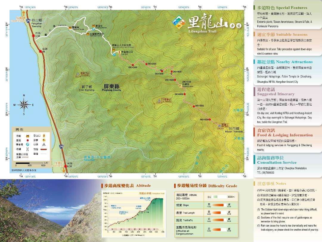 高約1,062公尺的里龍山又稱里瀧山,為臺灣小百岳之一,為中央山脈南端的延伸,也是恆春半島上唯一一座海拔超過1千公尺的中級山。里龍山地質多為厚層砂岩,不時可見高聳陡直的山壁及巨石林立的景觀。山頂視野展望良好,是條極具多樣景觀的登山路線。約1.5公里前屬私有地範圍。