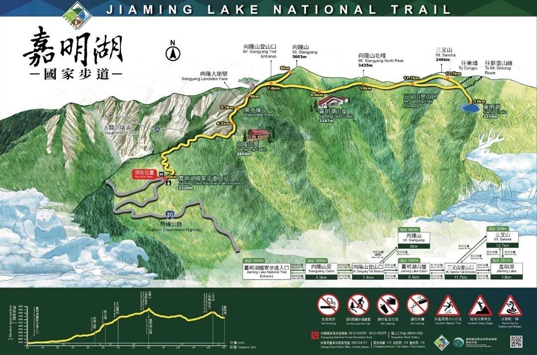 [開車前往]東部路線:台9線往台東縣池上鄉→轉台20甲前行約5公里→右轉接台20線進南部橫貫公路→154.5公里處向陽國家森林遊樂區內→嘉明湖國家步道登山口。[開車前往]西部路線:由國道3號官田系統→轉84號快速道路→至玉井,接台3線與台20線共線道路→往北寮、南化經甲仙、寶來、天池及埡口→向陽國家森林遊樂區。(本路線因埡口段封閉,西部暫不通行)