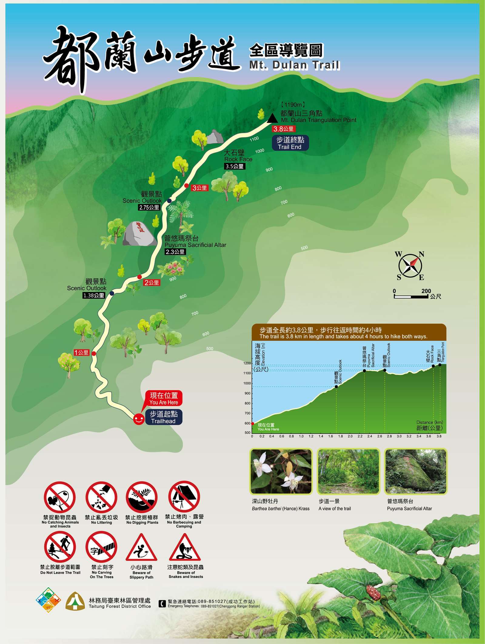[開車前往]臺11線:台11線海岸公路150.3,即見山路邊刻有著「都蘭山」的大石塊,是步道入山口→沿山路蜿蜒西上4公里見林務局新建二層式觀景平台,即本步道起登點。