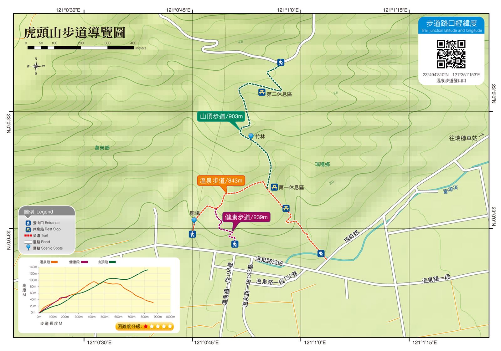 虎頭山步道路線呈「Y」字形,可分為溫泉步道(0.84km)、山頂步道(0.90km)以及健康步道(0.24km),步道平緩漫步於蒼翠的闊葉林中,第一休息平台綠意環繞,蟲鳴鳥囀不絕於耳,第二休息區視野極佳,可遠眺縱谷景觀、秀姑巒溪、海岸山脈、舞鶴台地及瑞穗街景。步道入口周圍種滿阿勃勒,夏天時有一片黃澄澄的花海;春夏之際,階梯上則佈滿白色油桐花;登上階梯至觀景平台,即為日治時代的神社所在地。步道前半段穿梭在青翠的桂竹林中,每年四至五月時,桂竹冒新筍,爭相從竹林下與步道邊冒出頭來。