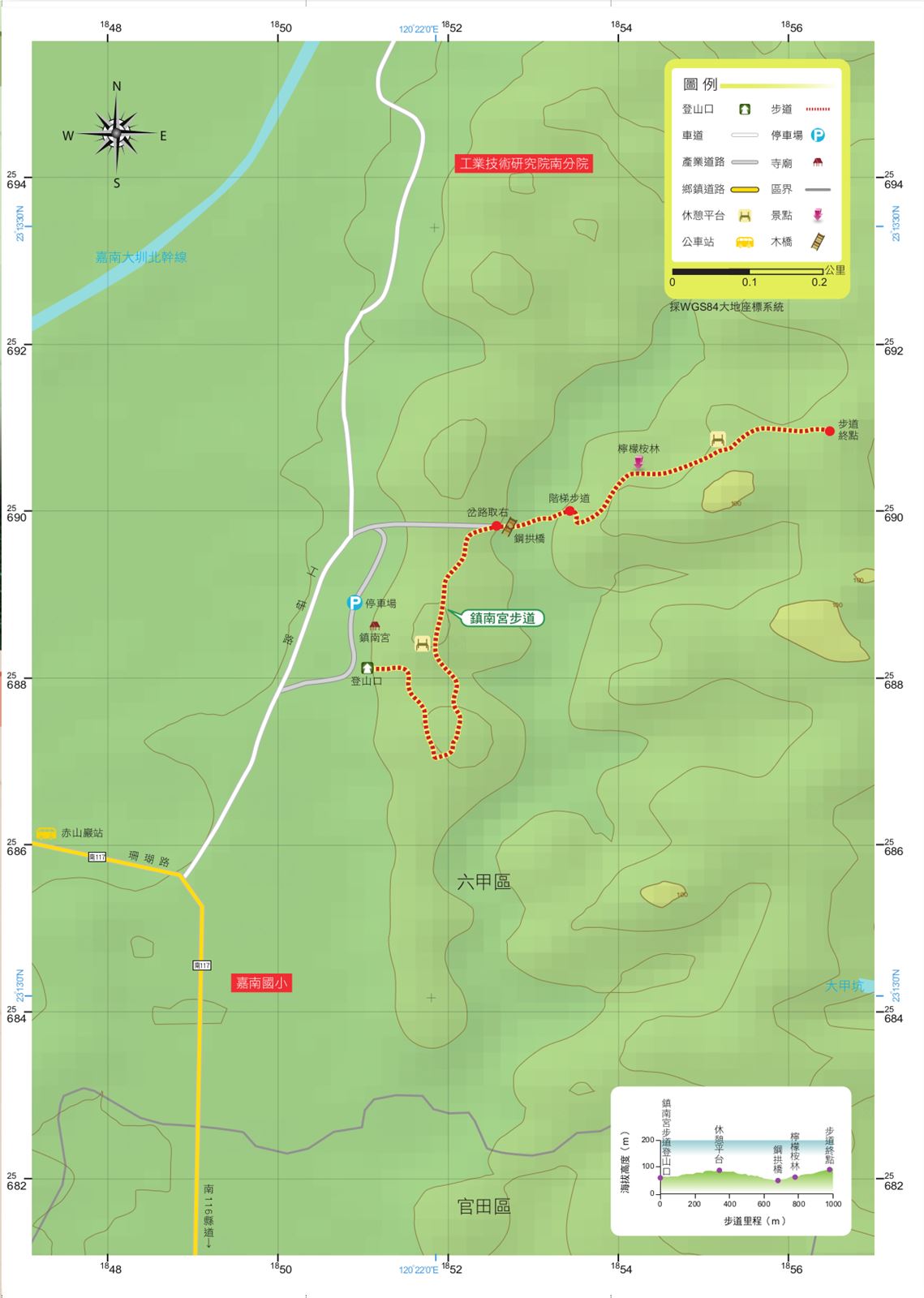 鎮南宮步道舊稱赤山步道,位於台南市六甲區珊瑚路鎮南宮的後方。全程約990公尺,步道寬廣坡度平緩起伏不大,極適合中、老年人健走。步道沿途指標清楚、林相優美豐富,除可鳥瞰烏山頭水庫風光,還可將六甲地區平原盡收眼底,為一條老少咸宜的休閒步道。尤其中途有筆直漂亮的檸檬桉樹林。