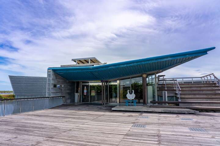黑面琵鷺生態展示館距黑面琵鷺賞鳥亭及主棲地不遠,建築物位於水上,特殊外型是為了不打擾自然生態,內部規劃有展示室空間,詳細介紹黑面琵鷺,包括黑面琵鷺生命史、濕地生態、保育運動及永續發展。(本展示館隷屬於農業部生物多樣性研究所)黑面琵鷺有「黑面舞者」美稱,被列為瀕臨滅絕動物保護,目前每年已有穩定的黑面琵鷺群,飛到七股曾文溪口來渡冬,約於9月至10月抵台,一直待到翌年的3月至5月。黑面琵鷺是白天休息,晚間覓食,下午4、5點開始,牠們才會開始玩耍、洗澡,或是互相整理羽毛,幸運的話更可以看到黑面琵鷺振趐飛翔的英姿。 除了大家耳熟能詳的黑面琵鷺外,曾文溪出海口大約有200多種候鳥,若單純以候鳥來看,冬天可以觀察到的鳥種較多,較常見的有鷗科、鷸科,留鳥則有常見的斑鳩、白頭翁等,鳥類資源相當豐富。