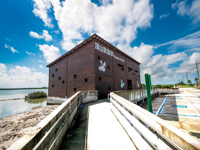 七股頂山地區多為魚塭及廢鹽灘地,對鳥類來說食源充足,人為干擾少,因此鳥況相當豐富,常見的鳥類有黑面琵鷺、黑腹燕鷗、反嘴鴴等。「頂山賞鳥亭」於106年設立,是一處木製兩層樓式建築,屬於遮掩式的賞鳥亭,設計得以觀看東、南、西、北四面鳥況,同時可提供觀看道路兩側、水面上、飛翔中、及接近水面等不同視角。賞鳥亭也規劃了無障礙設施及停車場,讓行動不便者能享受完善的賞鳥行程。頂山賞鳥亭的建築四面皆設有大大小小的觀賞窗,牆面貼有鳥類導覽牌,以圖文介紹周邊經常出沒的鳥類,賞鳥民眾可透過導覽牌對生態有更深的認識。擁有完善規劃的七股頂山賞鳥亭是一處適合親子走訪親近生態的好去處。