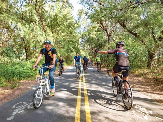 從海清宮出發,穿越四湖風力發電廠,騎乘在木麻黃的濃蔭之下,陽光自枝葉間灑落,高聳的風車緩緩轉動,鳥鳴此起彼落,輕踏著自行車踏板,以最舒適的速度徜徉在自然風光之中。這條舒適清幽的自行車道原為農用牛車道,在2012年開闢為自行車道,兩旁遍植沿海防風植物木麻黃,是西南沿海一帶少有的綠色自行車道。除了騎行,也特別適合在午後時分到此散步,穿梭林間還能輕鬆地欣賞濕地生態,車道兩側也建有涼亭,供遊客休憩歇腳。沿路看見的「天下一家」指標,就是通往「天下一家老兵居」,是榮民郭誠伯伯在退休後將自己一生的經歷,濃縮佈置成一間屋子。郭伯伯還在時,走入室內可見牆面上掛滿了輝煌的昔日照片,屋內還有許多收藏品,他還會將過往的故事同你娓娓道來。如今只能在途經此地時,看看這棟裝滿故事的房屋,遙想歷史。