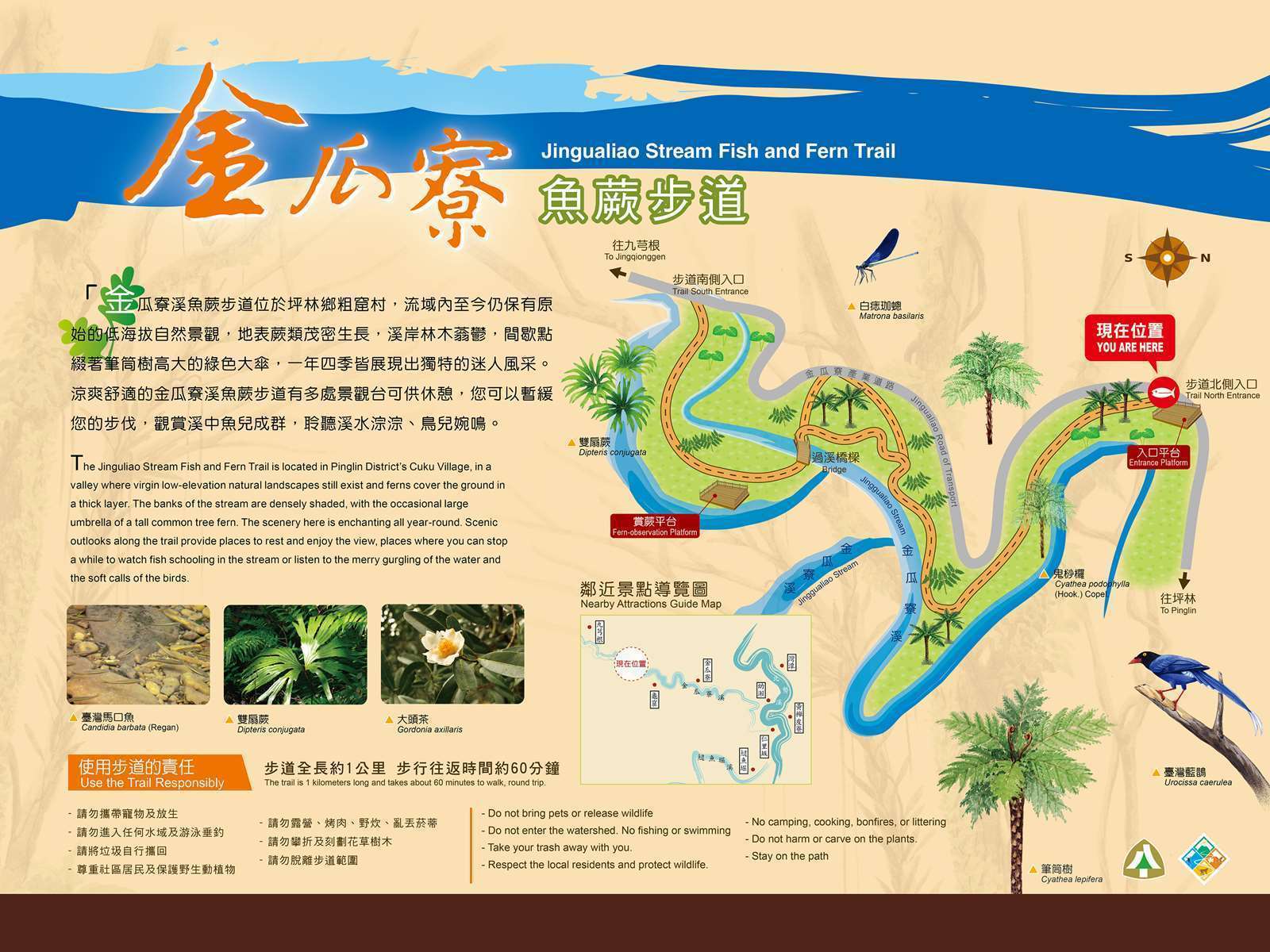 金瓜寮魚蕨步道位於新北市坪林區,步道南北端皆可出入。步道有拱橋及觀景平臺,有較多階梯,走出南出口後向南續行可連接到新北市坪林區公所轄管的觀魚蕨類步道。全線沿著金瓜寮溪蜿蜒行進,溪水淙淙,可觀苦花魚、馬口魚等,亦有多種蕨類,適合親子出遊。