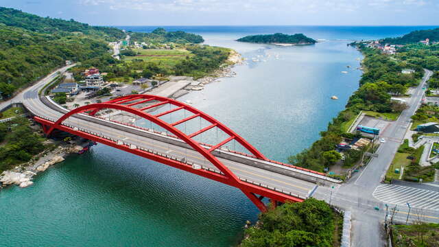長虹橋優雅的拱形橋身橫跨在秀姑巒溪出海口處兩岸,在山海交際之處形成一道美麗的虹影,成為東海岸的著名拍照地標,而這裡也是泛舟的終點站,一艘艘疲倦又滿足的泛舟筏在這裡靠岸。沿著步道在溪畔漫步,水鳥輕巧的在河床邊覓食,自行車來來往往,兩旁的植物隨季節變換風景,若是累了,不妨到附近的新太平洋1號店稍作休息,喝杯下午茶,度過悠閒的時光。出海口的奚卜蘭島,又稱作獅球嶼,綠意蒼蒼的小島是當地海岸阿美族的聖地,也是火山集塊岩構成的島嶼,由於溪流阻隔,保有相當天然的生態相貌,在河口覓食的鳥類、洄游魚類和蝦蟹都會在此聚集,是做生態觀察的好地點。