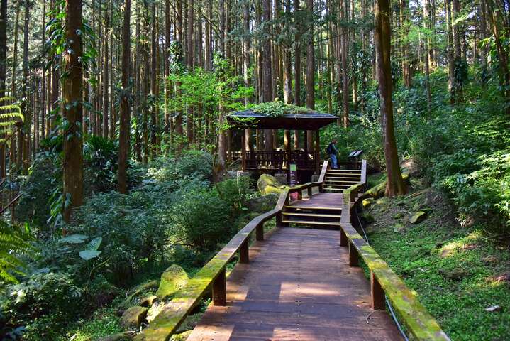 奮起湖環村步道系統:杉林步道-老老街支線、木馬棧道部分路段辦理施工改善中,請遊客依現場指示改道。沿途遍植柳杉和臺灣杉而得名,可分為兩段。其中一段出入口,位於第二停車場後方的土地公廟旁。另一段出入口,位於中和派出所附近的民宅前方。兩條路線,以「下腳店仔步道」南端出入口附近的產業道路做為銜接之路段。從土地公廟出發,順著鐵道旁的木棧階梯而下,經過一處與產業道路交會的路口之後,即進入一整片杉木林。高大、筆直向上的杉木群甚為壯觀,在高處環繞樹幹而生的蕨類,也在繁茂的森林裡爭取陽光和一席之地。環顧四周,林下多樣的原生植物及灌木叢也展現無限生機,不僅散發野地氣息,也釋放植物芬多精。而寬敞的木棧道和坐式護欄,亦為杉林棧道一大特色。隨後抵達的岔口,有另一條路線通往下腳店仔(老老街),也可回到奮起湖老街。續往前行,在一座雅緻涼亭等待林下鳥類悠揚的鳴唱,而後續等待的「天外福石」,相傳是土地公顯靈,才沒讓這巨岩滾落山下住家。繞過南端的福華公路,進入杉林棧道的另一段,再次從森林的邊緣地帶重回杉林秘境,並隨木棧道的一路帶領,即抵達另一端出入口。DATA步道長度︱全程約1,570公尺步行時間︱單程約90分鐘挑戰等級︱1級(親子級)出入口-A︱土地公廟旁 GPS:23°30'12.7"N 120°41'35.0"E出入口-D︱鄰近中和派出所 GPS:23°30'05.4"N 120°41'50.3"E奮起湖停車地圖