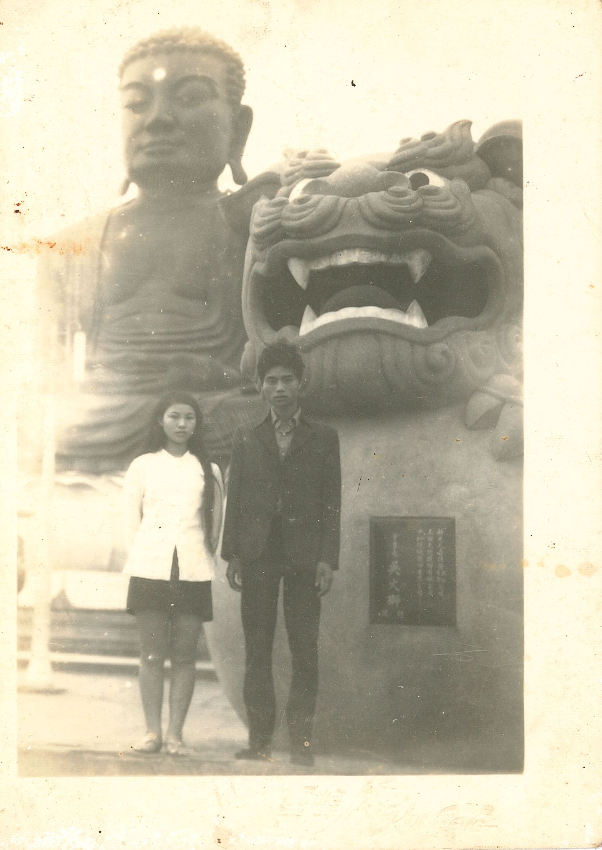 彰化八卦山大佛風景區出遊照。照片拍攝的時間約為1960年末至1970年代初 ,照片提供者為邱美華女士,此為她與丈夫到彰化八卦山大佛風景區出遊的照片(即照片中的人物),背景為盤坐在蓮花座上的八卦山大佛、石獅,此時兩人還尚未結婚,常一起到各地去旅遊。大佛風景區位於彰化縣八卦山半山腰,現今看到的八卦山大佛於1956年開始設計興建,於1961年大佛完工,大佛總體高達23公尺,後又陸續建造石獅、大佛寺、八卦塔、八卦亭、牌樓等附屬建築,是彰化縣具代表性的宗教名勝。